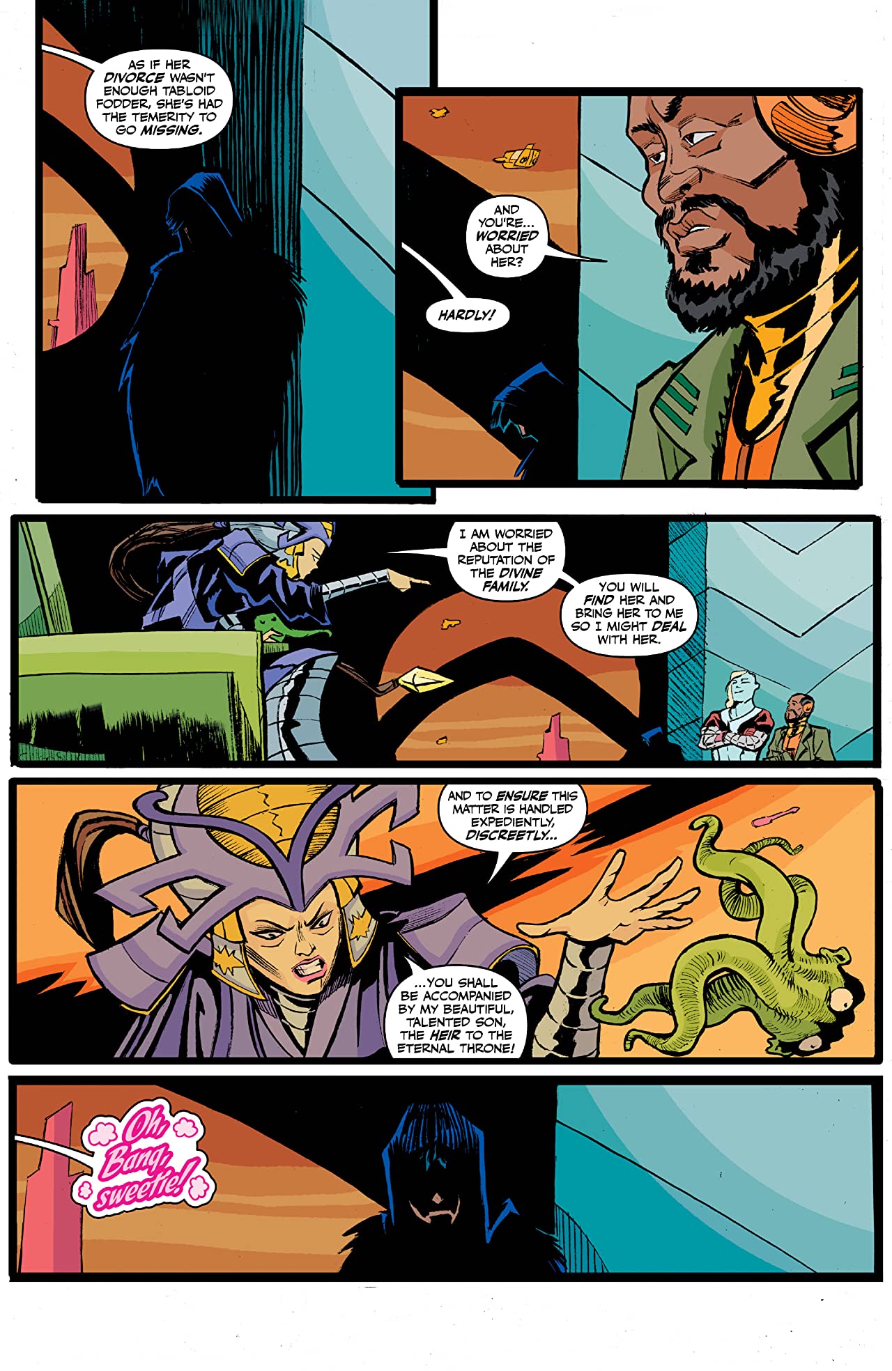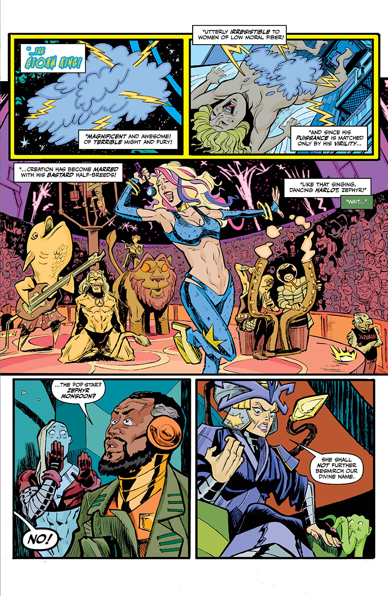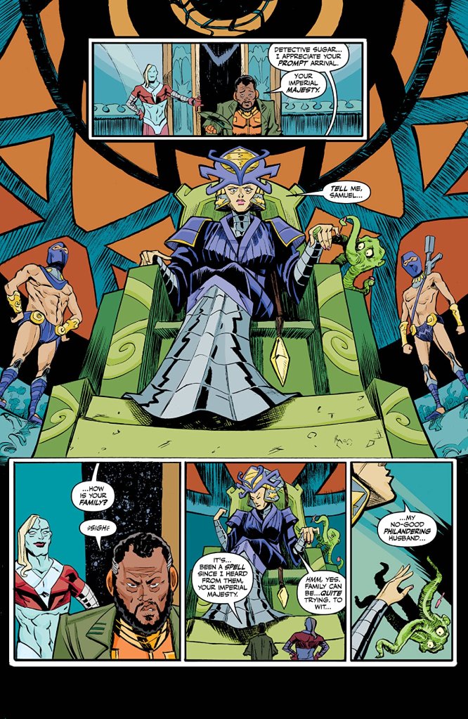 The pop sensation, Zephyr Monsoon, who just happens to be the illegitimate child of a Zeus-like Storm King has gone missing following a messy divorce. In order to try and keep the whole affair from blowing up into an epic PR disaster, her Imperial Majesty has sought the help of Dt. Sugar to solve the case. For insurance, the god-heir Bang is sent along as company. From this Imperial palace its off to the Wet Spot, like if the Mos Eisley cantina were a strip joint, and a lot more hullaballo.