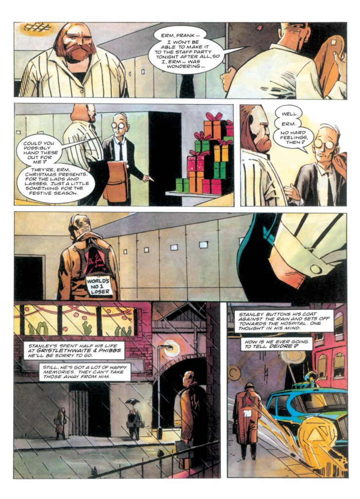 Wading waist-deep in dinosaur carcasses, scattered human limbs and an entire arsenal of “tactical nuclear artillery”, John Smith’s script for the second half of “Slaughter Bowl” must easily have made the majority of this comic’s audience carry a massive grin across their faces throughout the entire length of the race. For whilst the utterly insane sport’s coverage does contain the odd commercial break to allow the film crew to focus upon Chief Plastic Surgeon Cliff Hammond’s financially-fueled efforts to save Stanley Modest’s sick wife, the vast majority of this graphic novel’s sense-shatteringly paced final four instalments predominantly focus upon the bespectacled serial killer’s homicidal efforts to get his Parasaurus called Myrtle across the finishing line in one piece; “Stan! You gotta snap out of it! This is it, Stan! Your big chance!”