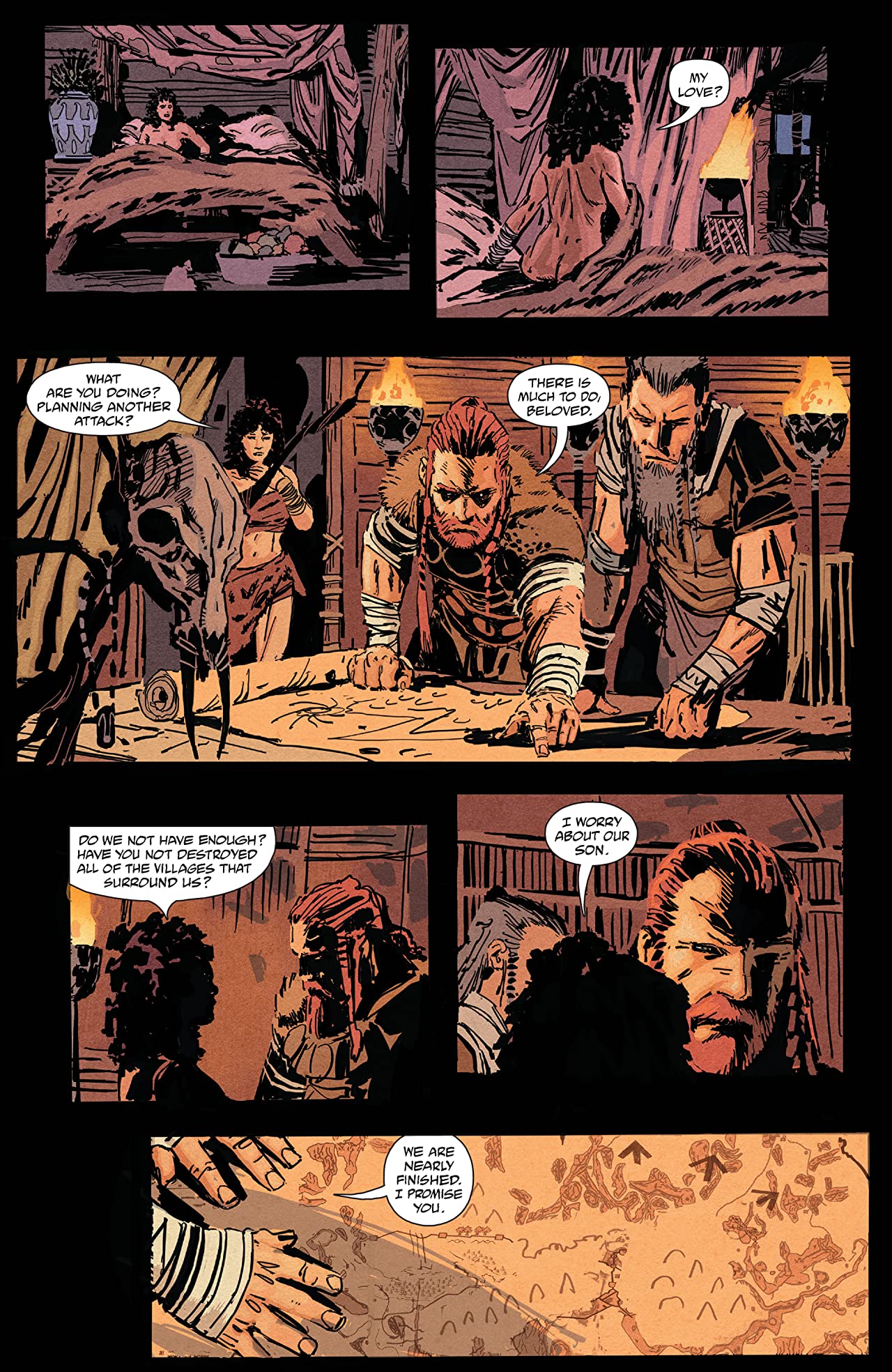 Intriguingly however, this comic isn’t solely reliant on gratuitous gore, thanks largely to a well-penned sub-plot concerning Berzerker’s (non-biological) father increasingly succumbing to the power his son’s immortality offers their tribe. Initially born out of a desperate desire to simply survive the repeated raiding parties striking their village to its very core, the young warrior is suddenly seen to be little more than a “tool” which, once fully-honed, will seemingly help the ambitious leader conquer vast expanses of land, and bring even those civilizations who offer no danger whatsoever to his rule under the headman’s vicious heel; “This village is so far, father. How can they possibly be a threat?”