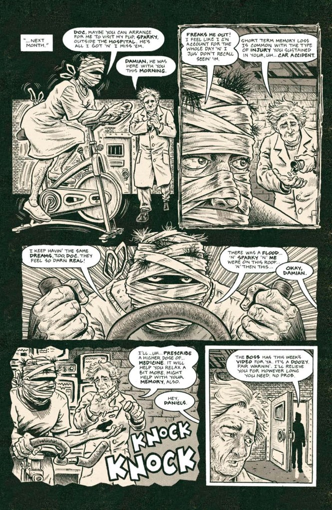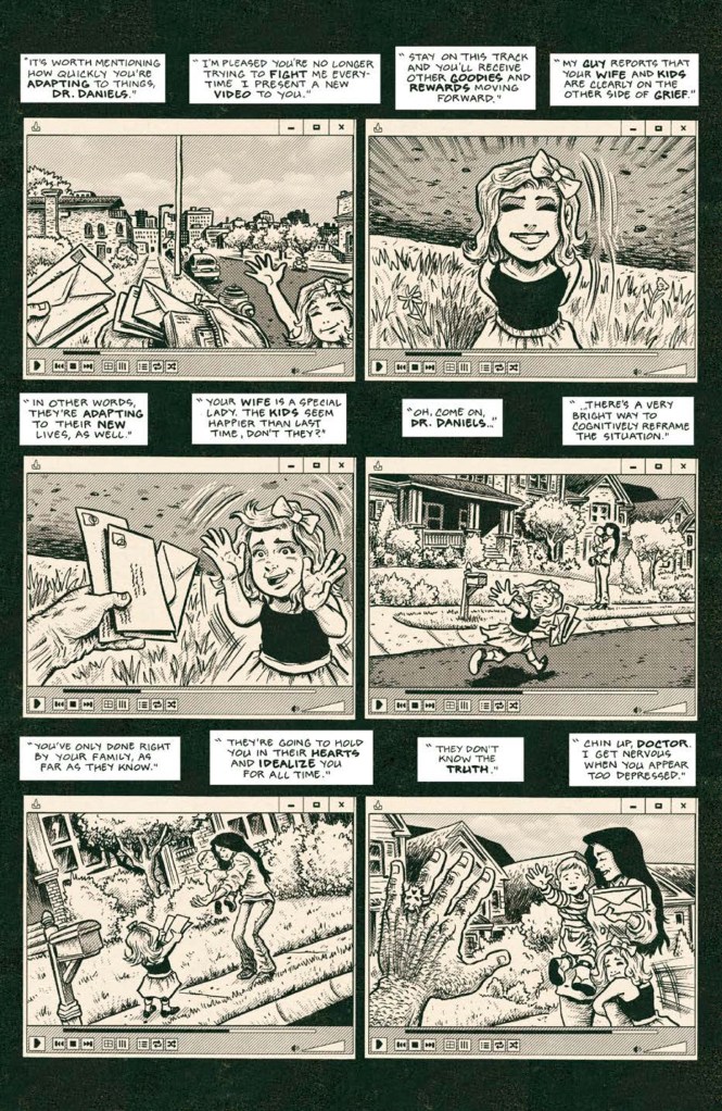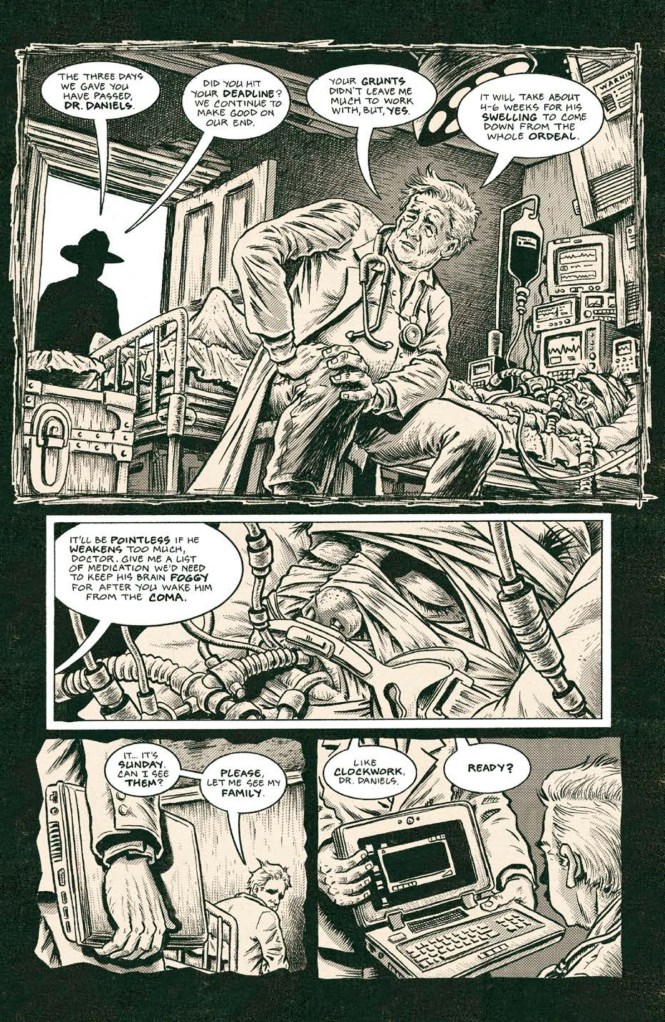 I’ll be honest though, this latest chapter didn’t quite sink its (thankfully metaphorical) hooks into me the way the first issue did, but there’s still an enjoyable “where the heck is this going?” undercurrent that keeps the pages turning throughout. The doctor’s story is basic but effective, with the inevitable fate of the poor unfortunate victim almost feeling like a secondary concern to Daniels’ fragile family situation and the events that are transpiring outside of his horrific captive bubble.