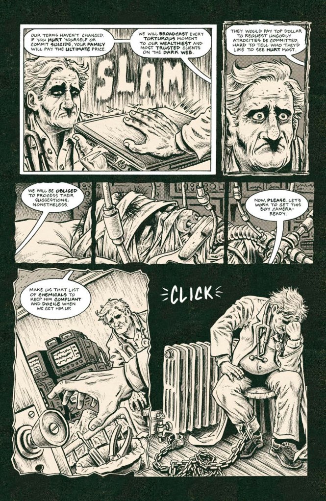While the first double-sized issue focused on Pentagram Productions, one of the top Red Room streaming companies on the dark web, and their recruitment of a brand new “act” called Decimator, this latest chapter shines the light on a rival company and the methods they employ to obtain a new victim to be brutalized by their star psycho Pokerface. As part of this process, we’re introduced to the unfortunate Doctor Daniels, who is held captive and forced against his will to prepare the victims ready for their moment on camera.