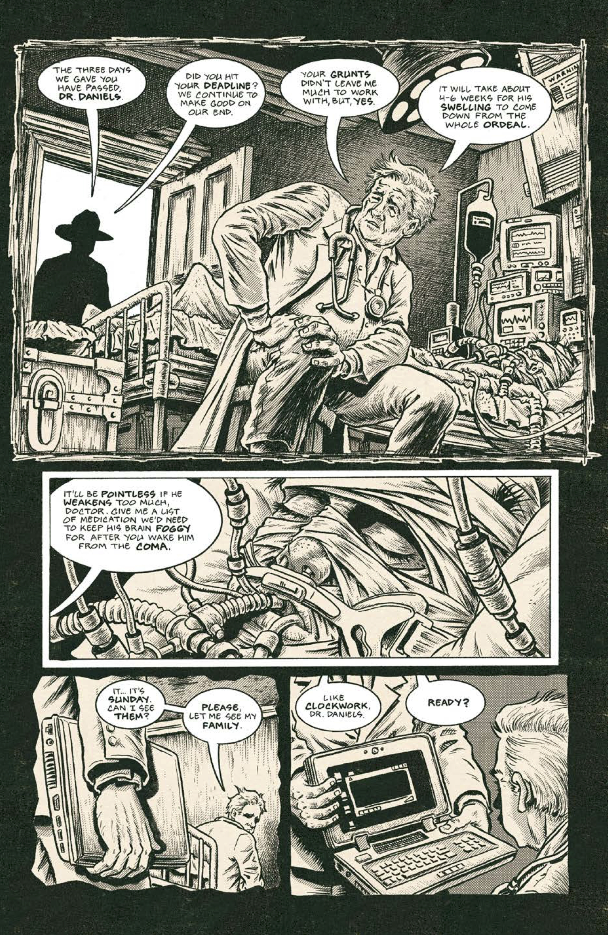 I’ll be honest though, this latest chapter didn’t quite sink its (thankfully metaphorical) hooks into me the way the first issue did, but there’s still an enjoyable “where the heck is this going?” undercurrent that keeps the pages turning throughout. The doctor’s story is basic but effective, with the inevitable fate of the poor unfortunate victim almost feeling like a secondary concern to Daniels’ fragile family situation and the events that are transpiring outside of his horrific captive bubble.