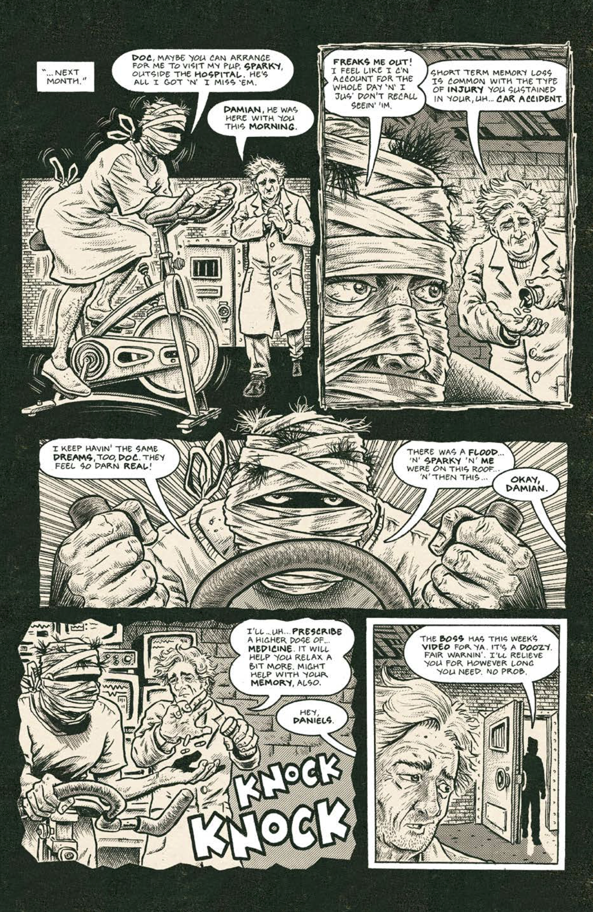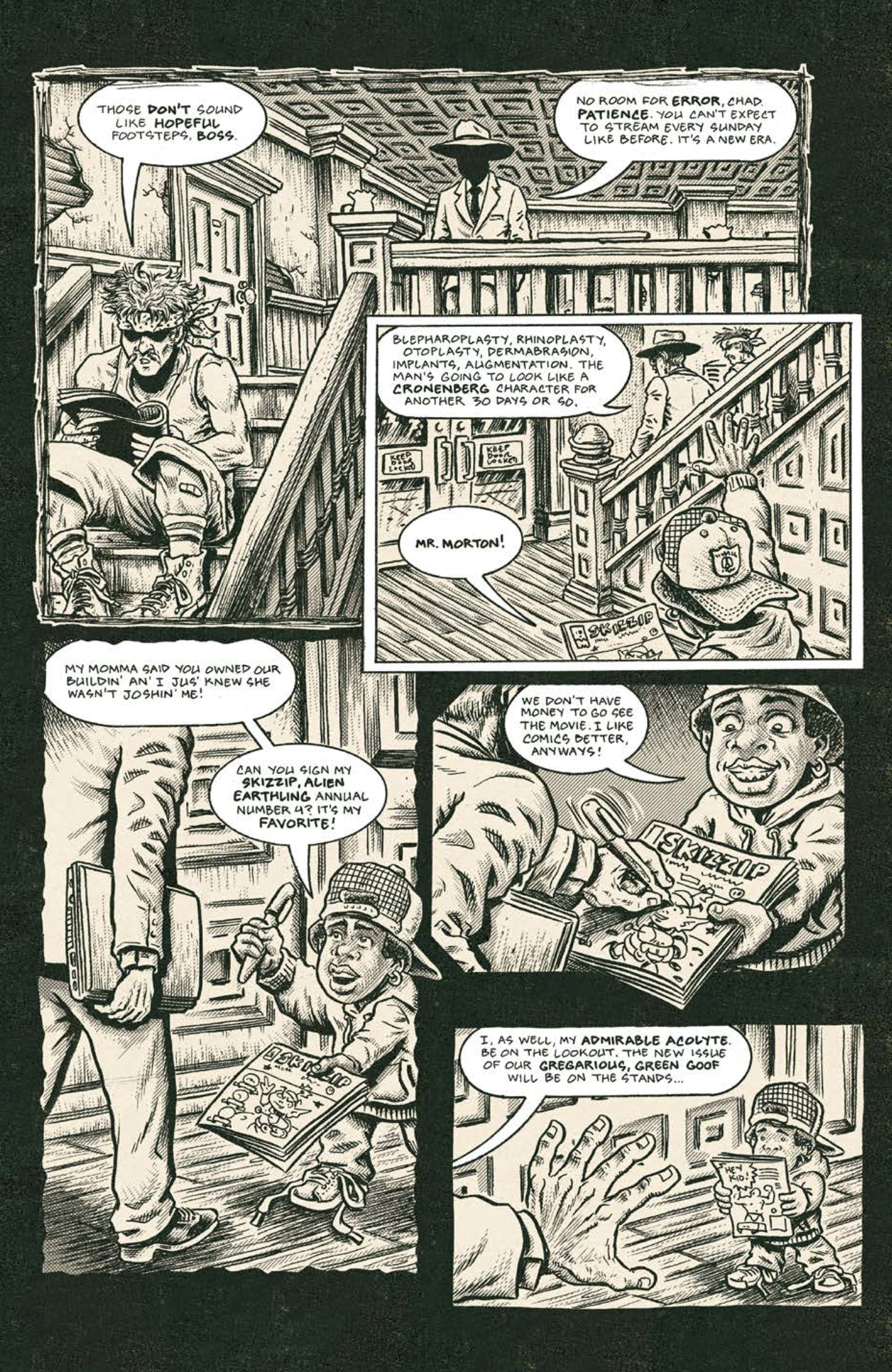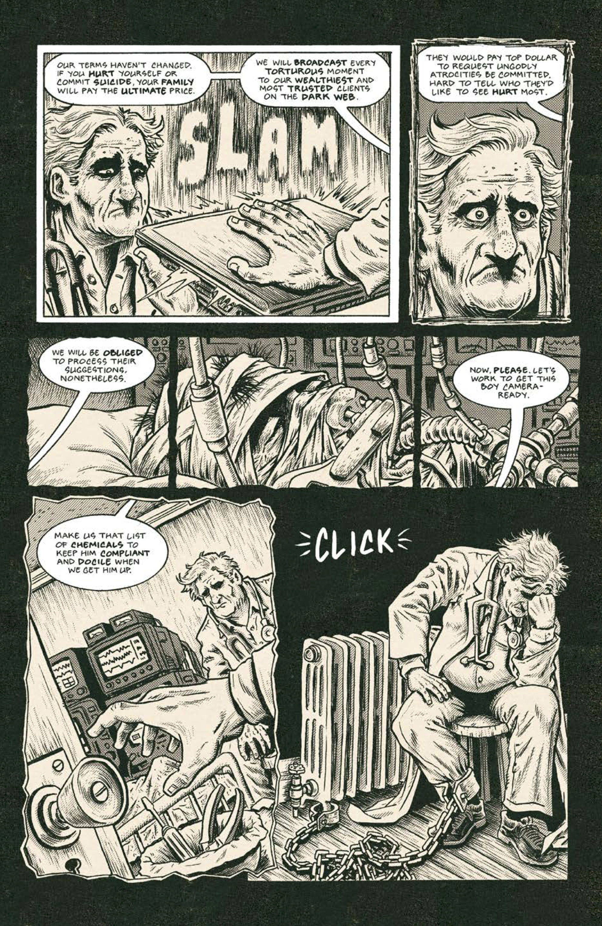 On the visual side of things, Piskor’s impressively detailed monochrome artwork fits the style of the comic perfectly. Characters are exaggerated, both in terms of their physical proportions and their facial expressions, and there are plenty of neat little details tucked away for eagle-eyed readers. The live streaming sections are brilliantly rendered, featuring a pitch-perfect comments section where affluent voyeurs turn out to be the same form of chat room detritus we’re all familiar with. The whole thing has the feel and aesthetic of a grimy underground ‘zine, in all the best ways.