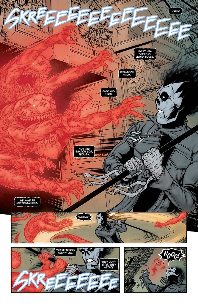 This compelling hook is made all the more irresistible by Bunn’s brilliant inclusion of several harrowing scenes which show some of Jack’s impressively-skilled peers already falling victim to the Pallbearer’s deadly assaults. The violent beheading of Spain’s keeper of secrets proves especially persuasive as an indicator of the lank-haired killer’s lethal abilities, and it is arguably hard not to feel a modicum of sympathy for the shaking, floating Loa as it realises that its own death is at hand, yet still tries to buy itself additional life by trading gossip and lesser known confidences with its invisible assailant.