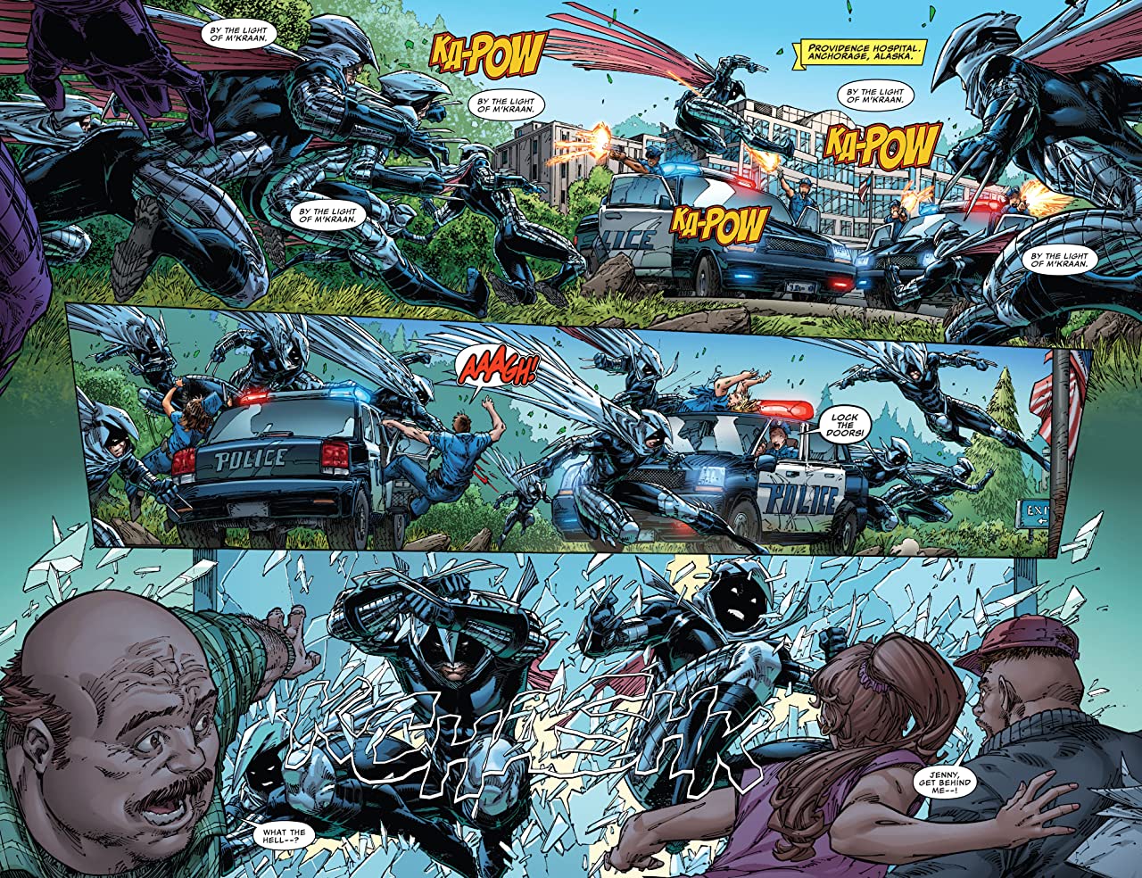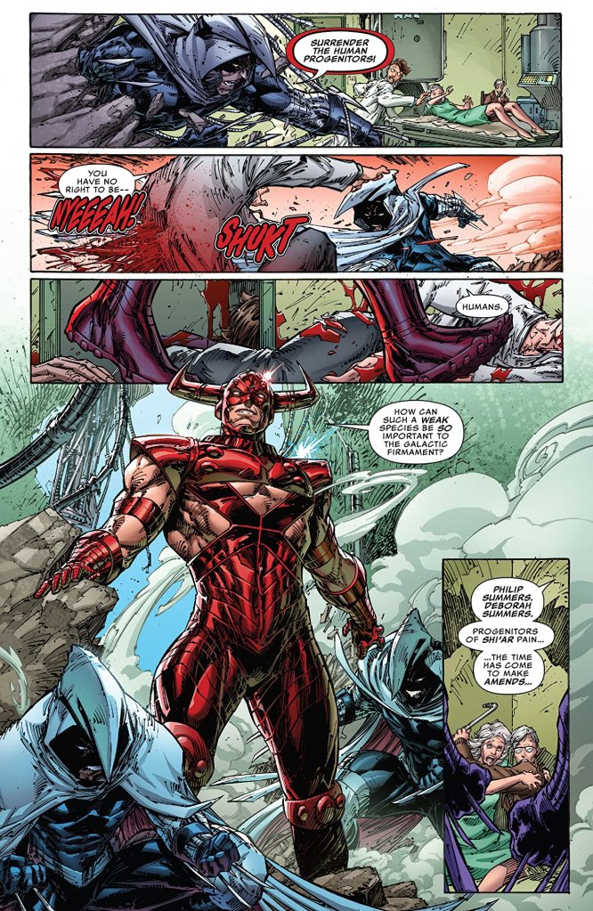 Indeed, arguably the opening half of this considerably-sized thirty-page periodical is bogged down in both an overly-long rationalisation as to just why Erik The Red would abduct Scott Summers’ grandparents from the Providence Hospital with a flock of Crystal Claws, and the history behind Adam Neramani covertly residing in Iowa on the planet Earth; “On the day my powers manifested, I learned I was not Shi-ar, or Mephitisoid, or even really Human. I was none. I was all. I was more. I was a mutant.”