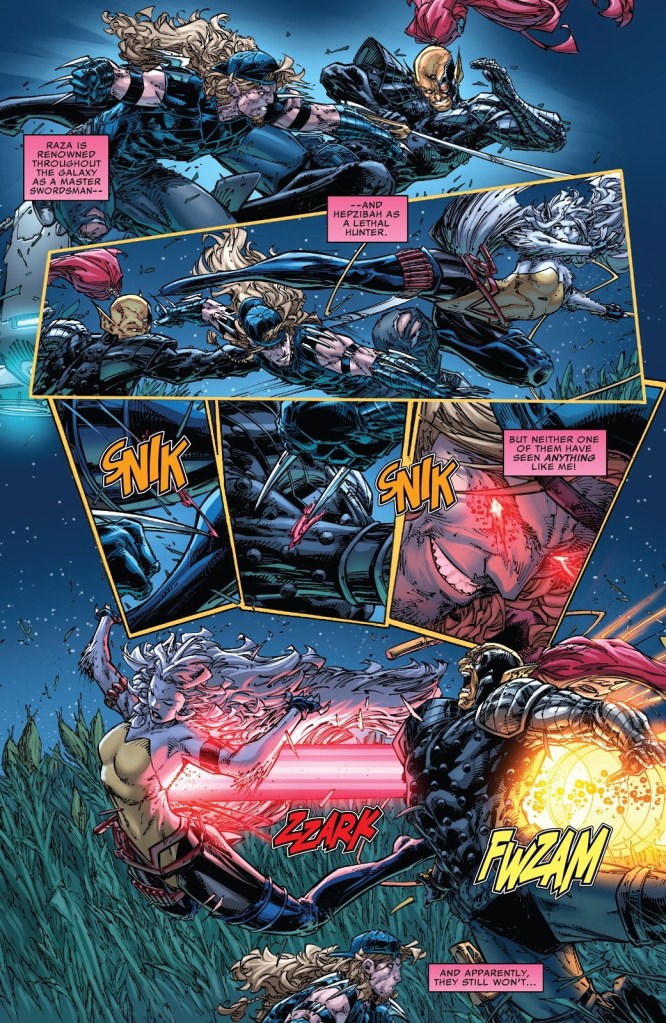 Happily however, once Cable makes an appearance to convince the “Disciple of the Claw” to seek out Cyclops and Havok of the X-Men, the pacing of “Shattered Crystal, Scattered Dreams” transforms into a seriously sense-shattering thrill-ride which doesn’t let up until its well-handled cliff-hanger. The arrival of Hepzibah and the cyborg Raza Longknife leads to some utterly insane action sequences, which not only mange to drum up plenty of suspense as to Adam-X’s survivability when facing the two lethally-skilled Starjammers, but also manage to progress the book’s central plot without resorting to too many of the aforementioned speech bubbles.