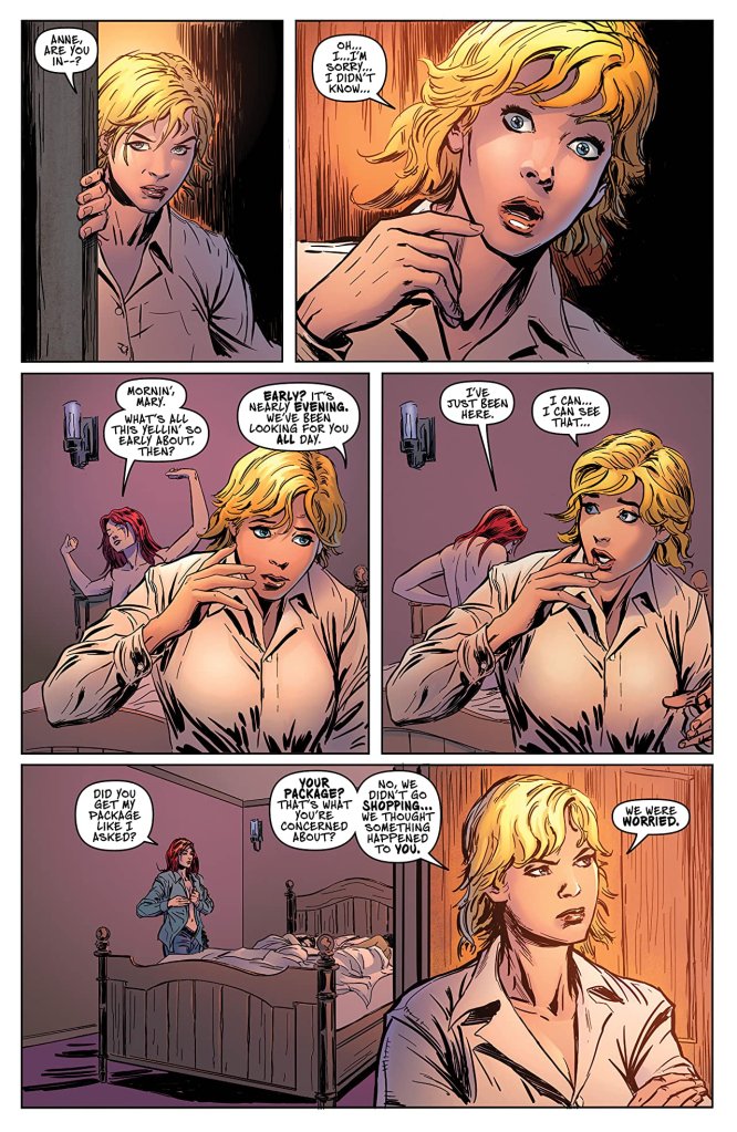 Initially depicting some distinctly sedentary-paced scenes involving Anne Bonny and “her crew of lady buccaneers” enjoying the rudimentary diversions of a supposed safe haven, Stephanie Phillips’ script for this opening instalment of the second volume of A Man Among Ye is probably best described as one containing two somewhat separate halves. For whilst Jane Castor’s brief attendance at a marvelously-envisaged puppet show certainly contains a modicum or two of tongue-in-cheek violence, it isn’t until the poorly disguised noblewoman encounters some knife-wielding ruffians down a darkish alleyway midway through this twenty-page periodical that things start to get truly interesting.