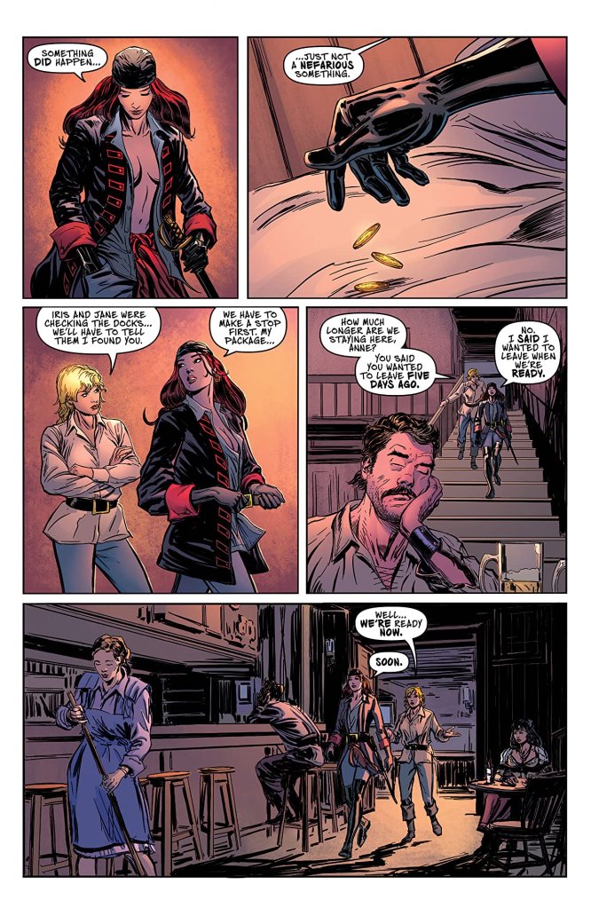 Indeed, up until Iris reaches for her trademark hand-axe to confront a sinister-looking, one-eyed vagabond, the most excitement this comic’s audience can arguably hope for is either Mary Read’s haughtiness over the Pirate Queen’s protracted sleeping habits or a marionette of Woodes Rogers treacherously slaying a poor-thinking pirate as part of a well-received theatre show; “Anne brings us to this sh*t port and then disappears with booze and whore while I tend the boat and clean her messes. Someone here has to at least try to do something about this situation.”