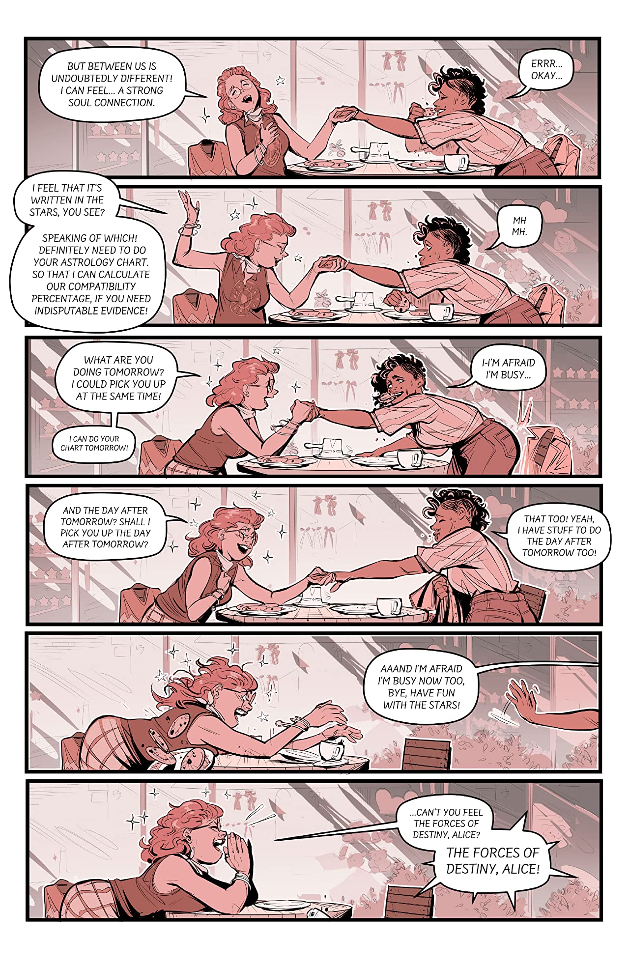 Romboli’s artwork continues to be an absolute treat as the spotlight shines a little more brightly on Robin throughout the course of this issue. Opening with her latest passionate tryst and subsequent slightly toxic (over)reaction, Robin’s seemingly unfulfilling lifestyle is put centre stage here, providing a slightly more serious counterpoint to Alice’s lighthearted antics. Romboli handles both moods with equal flair though, displaying a depth of detail and expression that reminds me at times of Joëlle Jones.