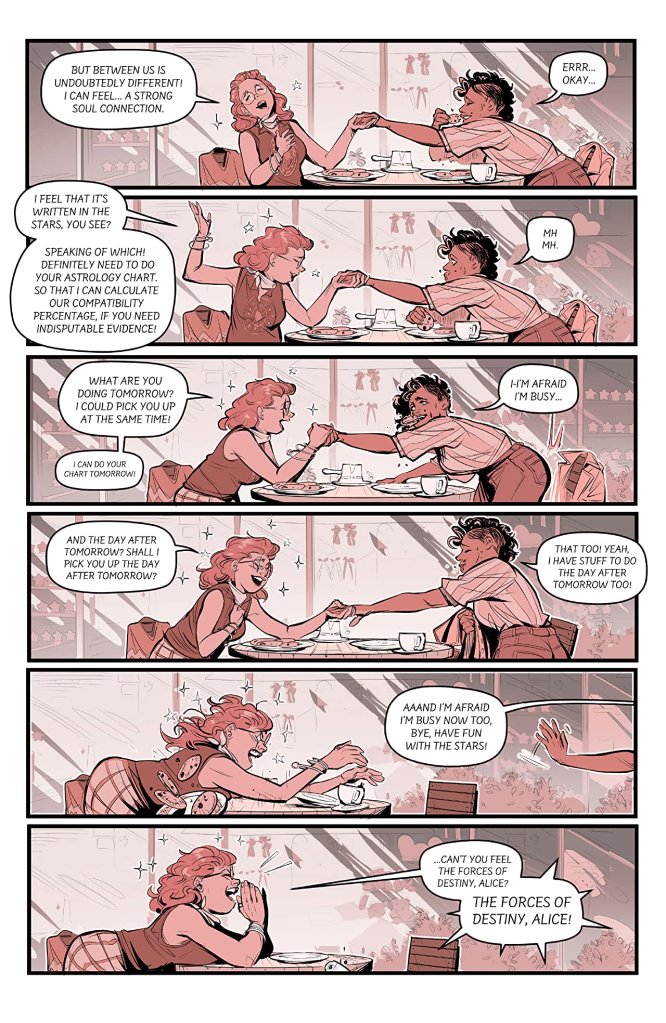 Alice’s trials and tribulations with online dating provide a humorous backbone to the story, with this latest issue featuring a pair of chuckle-worthy liaisons – each recapped in glorious ‘children’s story book’ style – but it’s the interactions between her and Robin that gives the series its heart. That said, their complicated relationship is starting to feel less like “will they, won’t they?” and more like “should they?”, although the creators have done a good job of building up an impressive level of investment in both of these seemingly unsuited characters.