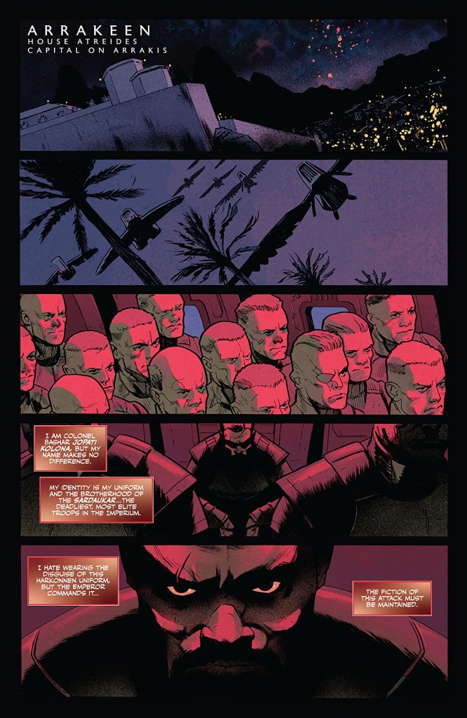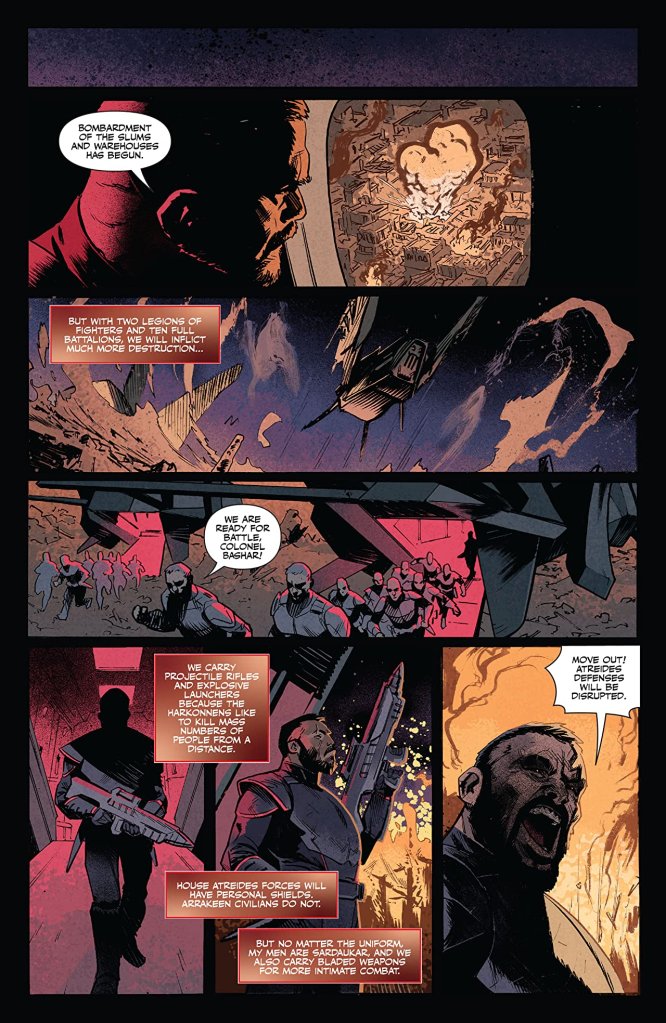 Whereas the recent run dealt with the lead up to the events of the first novel and the eagerly anticipated new movie, this opens during the height of the action on Arrakis as the forces of House Harkonnen, secretly aided and bolstered by the Sardaukar, lay waste to the unsuspecting Atreides in Arrakeen.