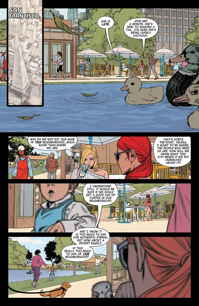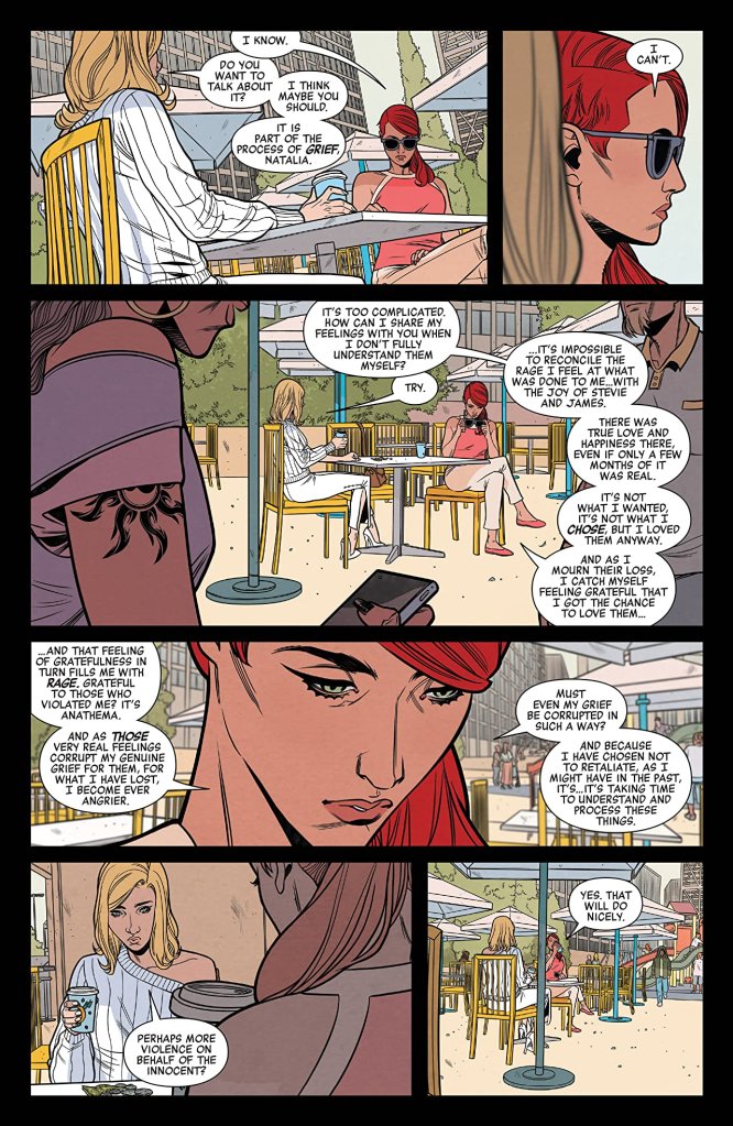 Likewise, Thompson presents a fascinating insight into her incarnation of Natasha Romanoff, and the black-clad assassin’s warm relationship with the White Widow. This comic’s opening rather nicely shows just how close the two women have become emotionally since the red-haired Avenger ‘lost’ her baby son, Stevie, and this greatly adds to the Russian’s somewhat ‘tongue-in-cheek’ attitude later on when she realises Belova has unwittingly walked straight into the very heart of Apogee’s criminal underworld, and is going to “be spitting mad when I rescue her…”
