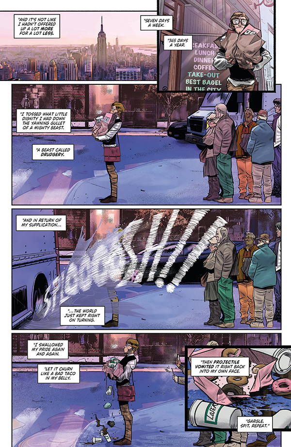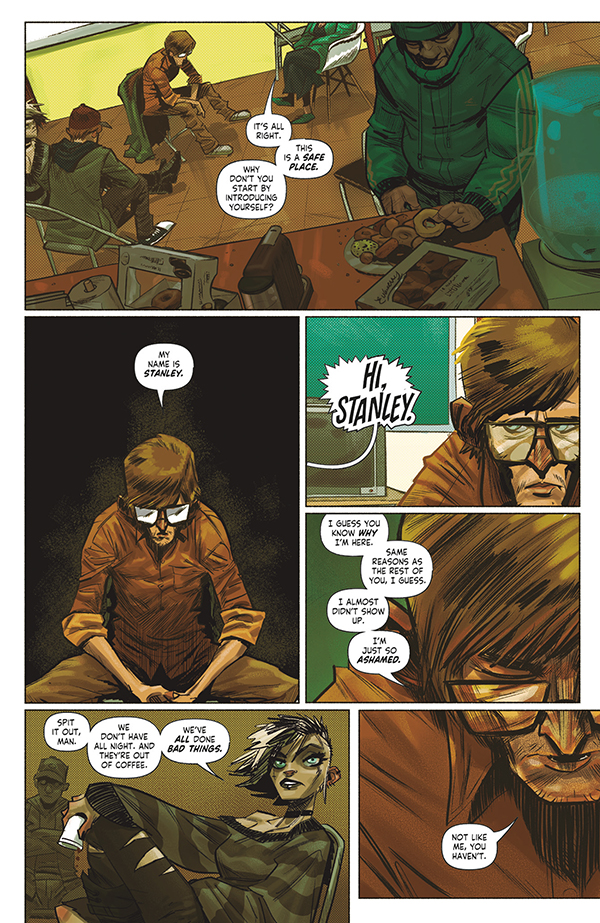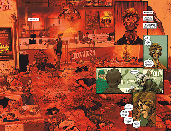 Speaking of which, Fran Galán’s artwork really makes Bunn’s story jump off the page. Stanley’s normal every day life is delivered in such a way as to make you cringe, and feel angry at and for Stanley. Zed’s normal every day life, however, is painted in nightmares of scarlet and gristle and globs of tortured flesh and it’s just glorious.