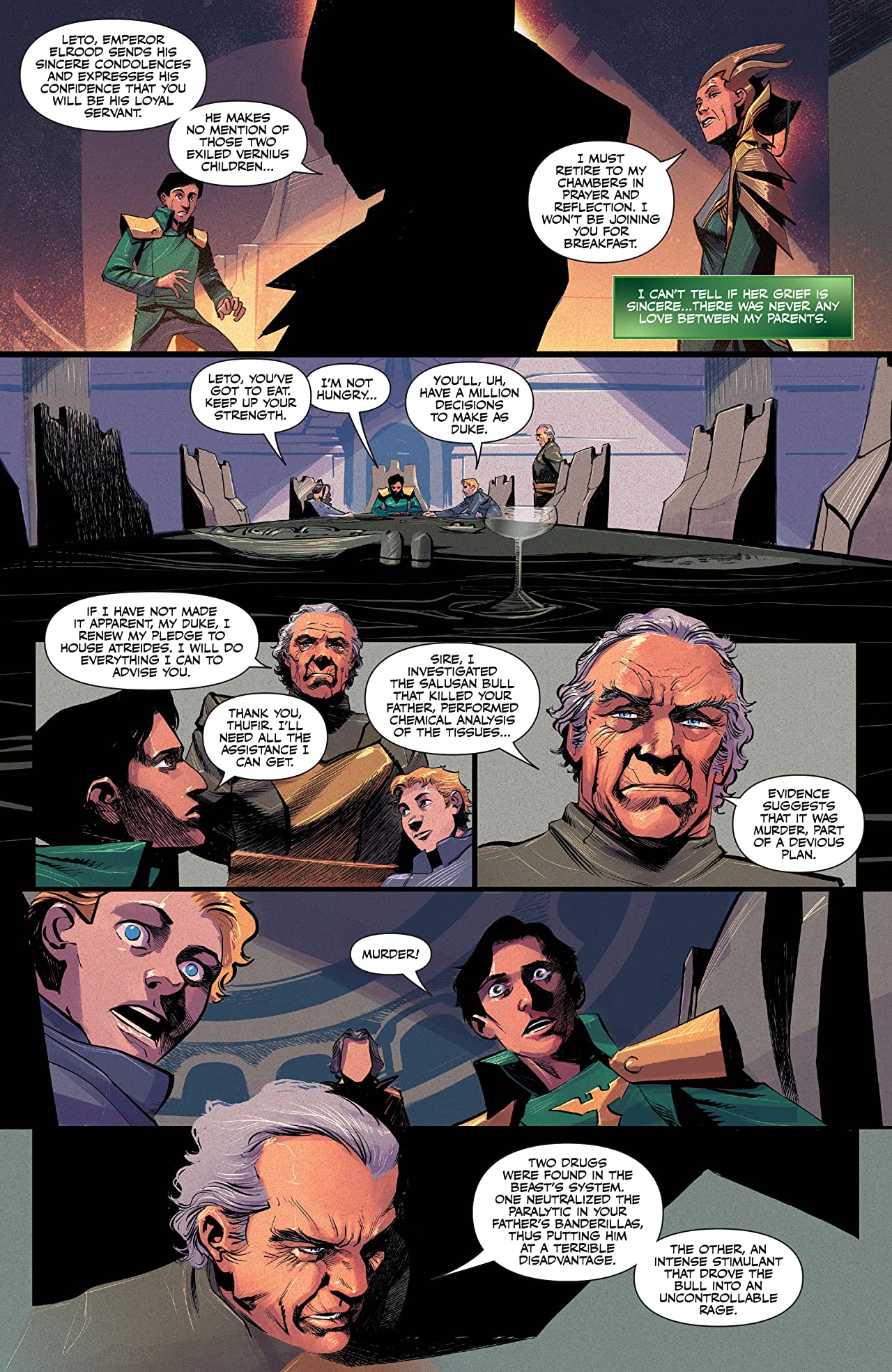 Considering just how enthrallingly impactful this publication’s opening is, as the newly ‘crowned’ Duke Leto Atreides presides over the investigation into his father’s tragic death, it is in some ways a pity that this comic book adaption’s narrative soon shifts its attention away from Caladan and transports its audience to the likes of Ix and the Spacing Guild’s central planet instead. Indeed, Brian Herbert and Kevin J. Anderson’s ability to project the emotionally tense atmosphere within the young nobleman’s courtroom is so palpable that an entire issue dedicated solely to Thufir Hawat’s initial findings, young Duncan Idaho’s passionate recollection of his multiple warnings concerning the killer bull’s temperament, and the subsequent interrogation of the Stablemaster would arguably have proved no chore at all.