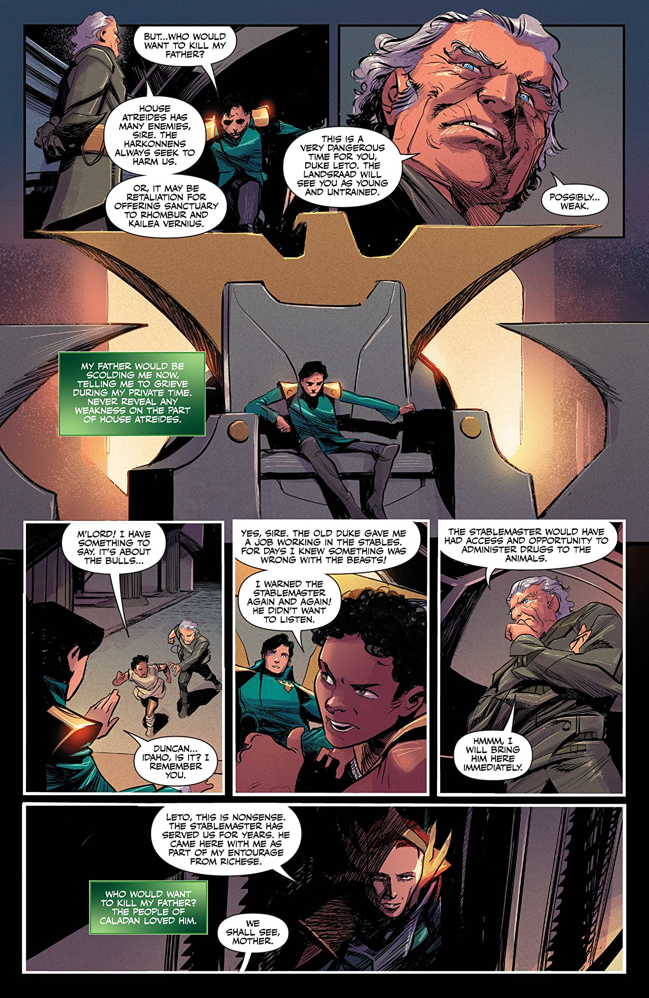 Ably aiding this comic’s storytelling are Dev Pramanik and Mariano Taibo’s artwork, which together do a proficient job in portraying the duplicitous political posturing occurring upon both Kaitain and Giedi Prime. However, it is the penciling of Leto’s increasingly sombre mood which really catches the eye, as Pramanik really manages to imbue the somewhat thin, diminutive figure sat upon his father’s great throne with all the haunted looks a reader might expect from one so young being suddenly thrust into the limelight of the Landsraad and proclaimed “Head of a Great House.”