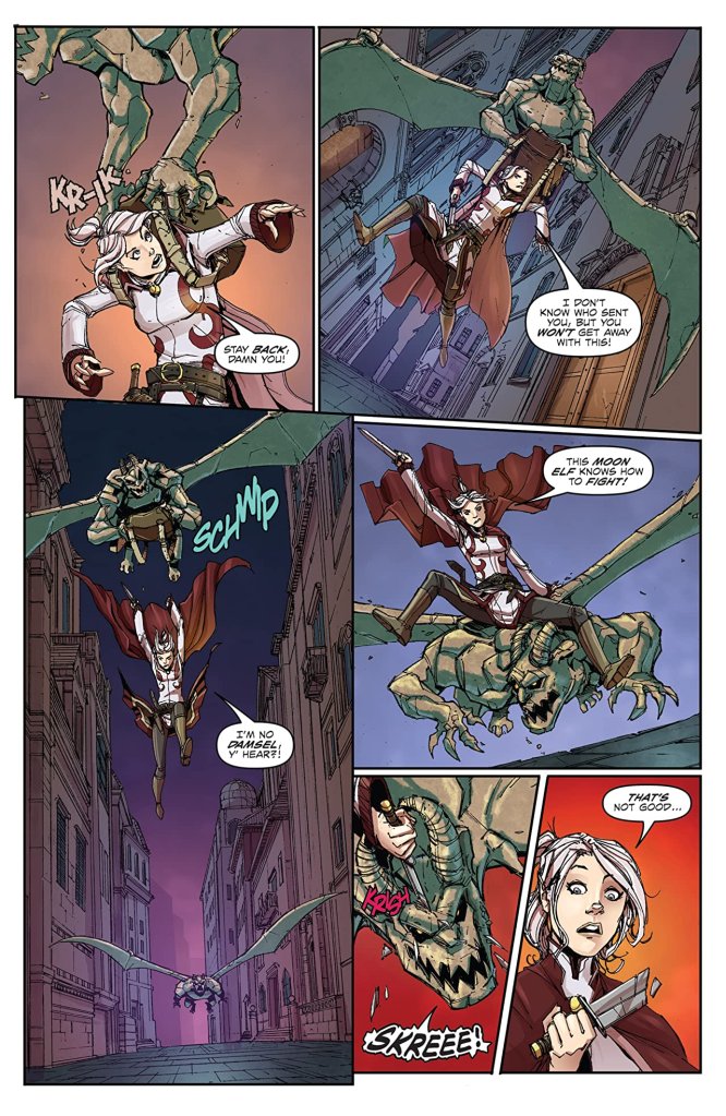 Featuring both a headlong dash through “the bustling urban centre”, and some sense-shattering swordplay by the Rashemaar warrior Minsc, this comic arguably doesn’t need to contain a letter from series writer Jim Zub to show just how much the fantasy tabletop role-playing game means to the Canadian author. Indeed, the Animex Honorary Award-winner’s love for Dungeons & Dragons resonates from every panel of this twenty-page periodical, as the moon elf Delina desperately attempts to outwit a pair of stone gargoyles amidst a delightful mixture of deadly danger and laugh out loud humour; “Stand down, dirty minions of evil — Or face my hamster’s wrath!”