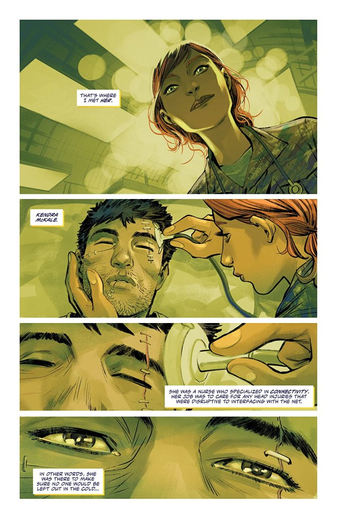 All the good stuff I mention above carries over so there’s thankfully no drop in standard. I always expect a touch of world building and history with stories like these and was happy to see this in the opening panels. What better way to start than with a world war? Deftly summarised in but a few pages, the opening here maintains that use of the sci-fi genre to push or prod us into related questions. Here we fight and rail against a decline in the West with a tech war that was over before the first round was ever fired.