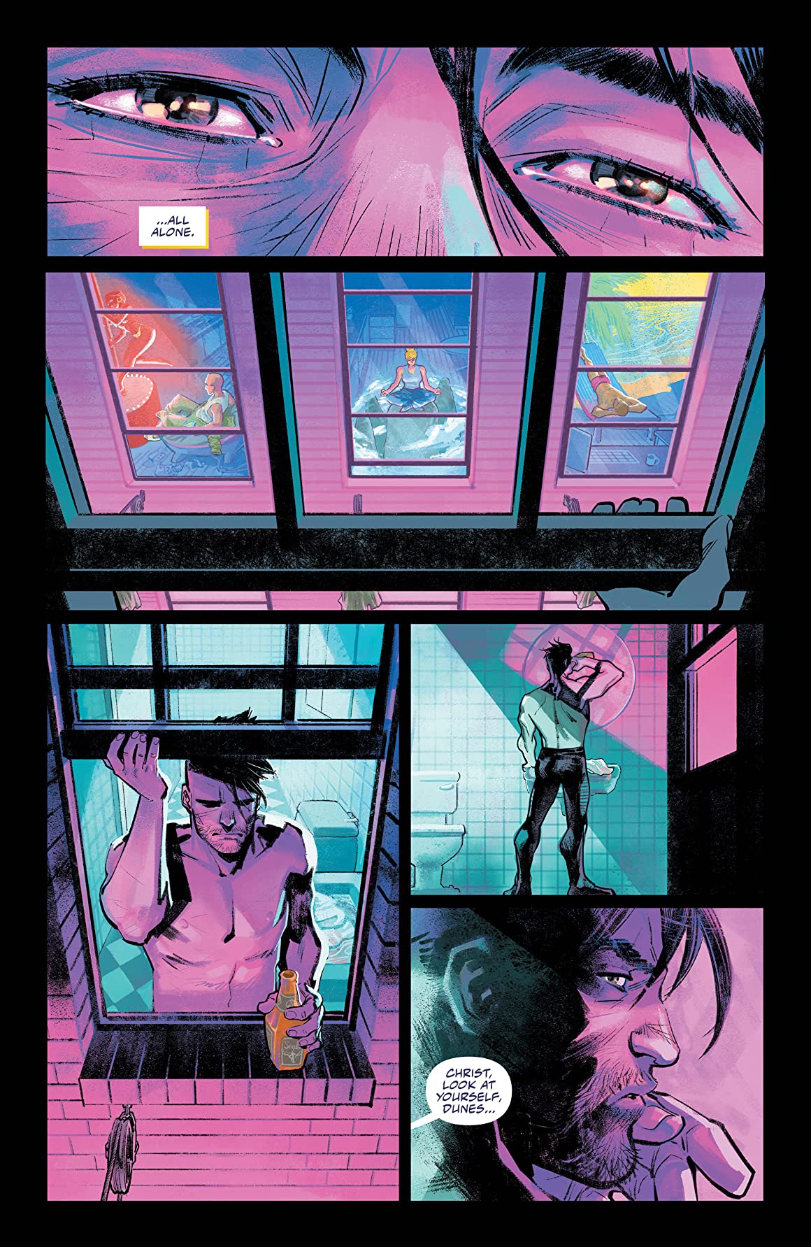 The artwork is tight and engaging throughout. Manapul seems as comfortable with rainy cityscapes as they are with vehicular chases or expressive characters. The concept of the veils is portrayed very effectively. I had first thought that I would have preferred to see some gonzo ‘in your face’ cutaways to really drive home the myriad visuals that must exist. Upon reflection though, the way we experience it here still manages to deliver this but is probably far more in keeping with the overall tone. The colouring weaves hints of neon with subtle, dingy drudgery which, along with the lettering, provides a pleasant read where the challenge comes from the story.