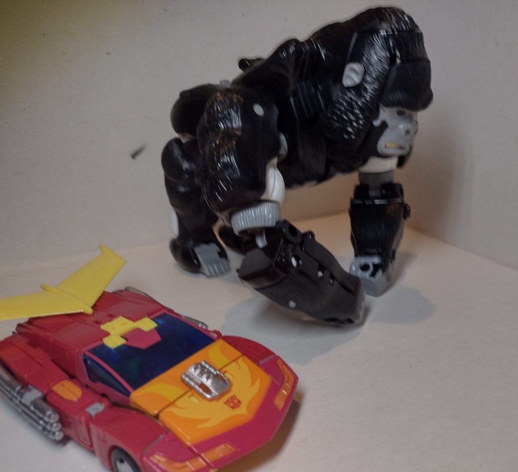 The transformation is really simple – it is just turning a man into a gorilla – and, once you’re finished, you end up with a pretty decent Beast Mode. A lot more grey comes out in this mode and I feel that this makes for a really convincing non-transforming gorilla toy. All the articulation is retained from robot mode, except from the head motion. Its a shame they weren’t able to incorporate some movement into his head. The poseability does allow for the cliché gorilla poses.