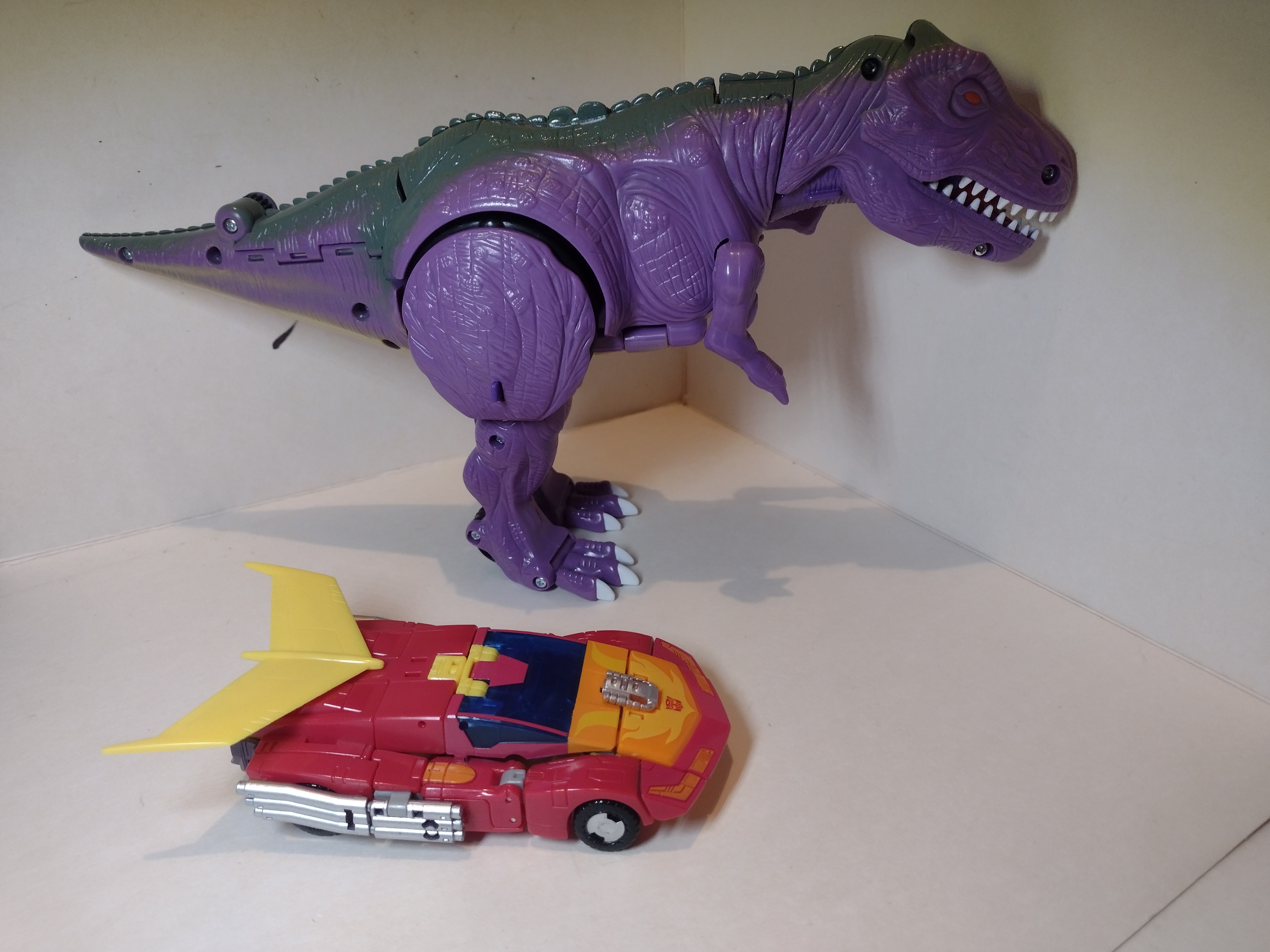 The articulation is surprisingly good for a toy line that was sandwiched between G2 and RID. I think it’s because Kenner (the Star Wars designers) headed this line. It doesn’t hold a candle to modern poseability, but the ball joints allow for extra swivels (or it would if they didn’t pop off all the time.). Size wise, he’s a head taller than the core class figures (see above) and is shorter than his great aunt Arcee.