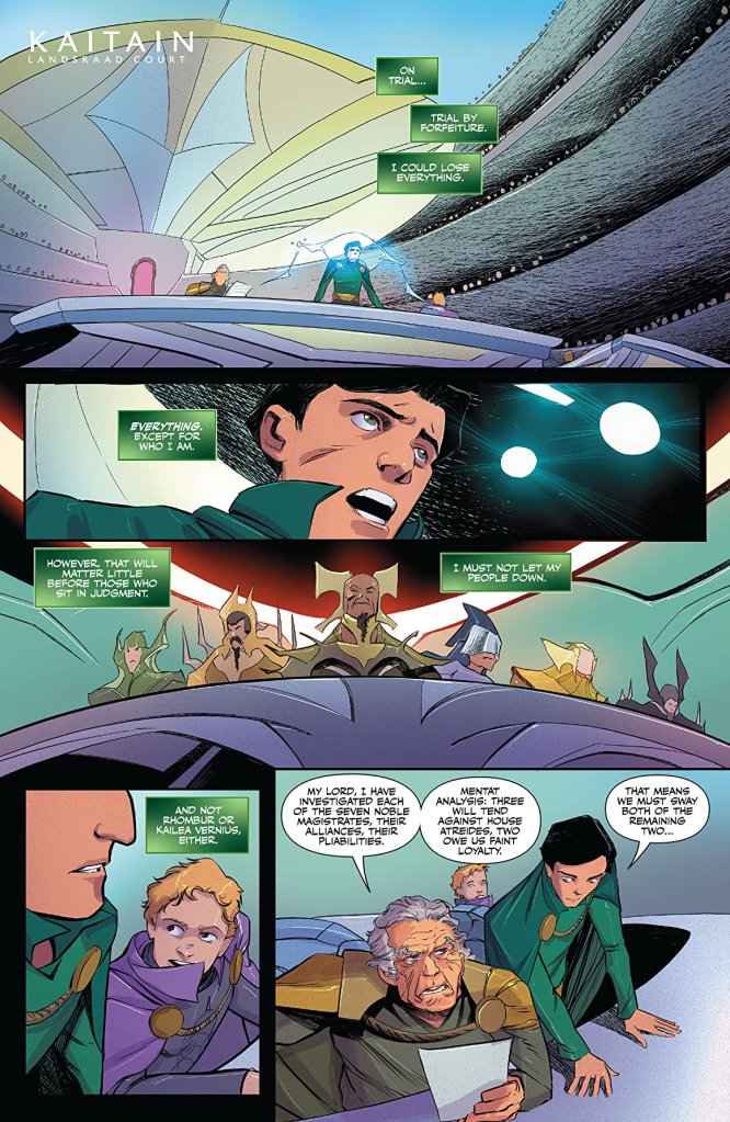 Bringing their twelve-issue long comic book adaption to an end, Brian Herbert and Kevin J. Anderson’s narrative for this twenty-two page periodical undeniably brings some semblance of resolution to the trials and tribulations of Duke Leto Atreides. But whilst the young ruler of Caladan succeeds in protesting his innocence before the great Landsradd Court on Kaitain, courtesy of a personal plea by the upcoming Padishah Emperor himself, the vast majority of this publication disconcertingly seems much more concerned with laying down the groundwork for the collaborative authors’ subsequent printed chronicles rather than even partially resolving the numerous character-arcs of this particular storyline’s sizeable cast.