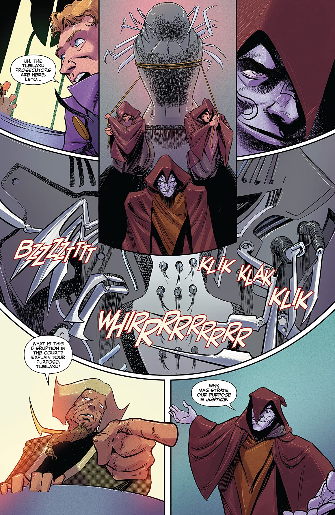 Happily however, what Issue Twelve of “Dune: House Atreides” debatably lacks in satisfying resolutions, it does make up for with some eye-pleasing pencils. Dev Pramanik’s layouts for the Tleilaxu wheeling their torture device into the court-room and enthusiastically declaring their intention to “drain every drop of his blood” if they succeed in their prosecution of Leto are tremendously well-drawn, as is the determination upon Dominic’s grim visage to have his revenge upon the murderers of his beloved wife, when the embittered Earl visits her final resting place on Bela Tegeuse.