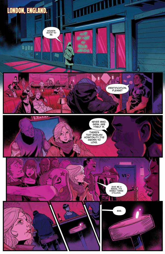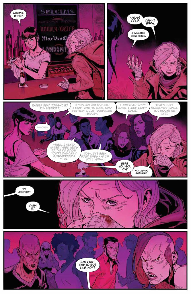Joe Jaro does a great job with the artwork, blending detail and dynamism to deliver a style that has just a hint of Dan Mora to it, and which keeps the pages turning smoothly throughout. Joana Lafuente also does a typically stellar job on the colours, from the hazy purples of the Vampire-infested pub to the fiery oranges of the mid-issue tragedy, and her work here proves to be bit as vital as Jaro’s when it comes to selling the tone of this story.
