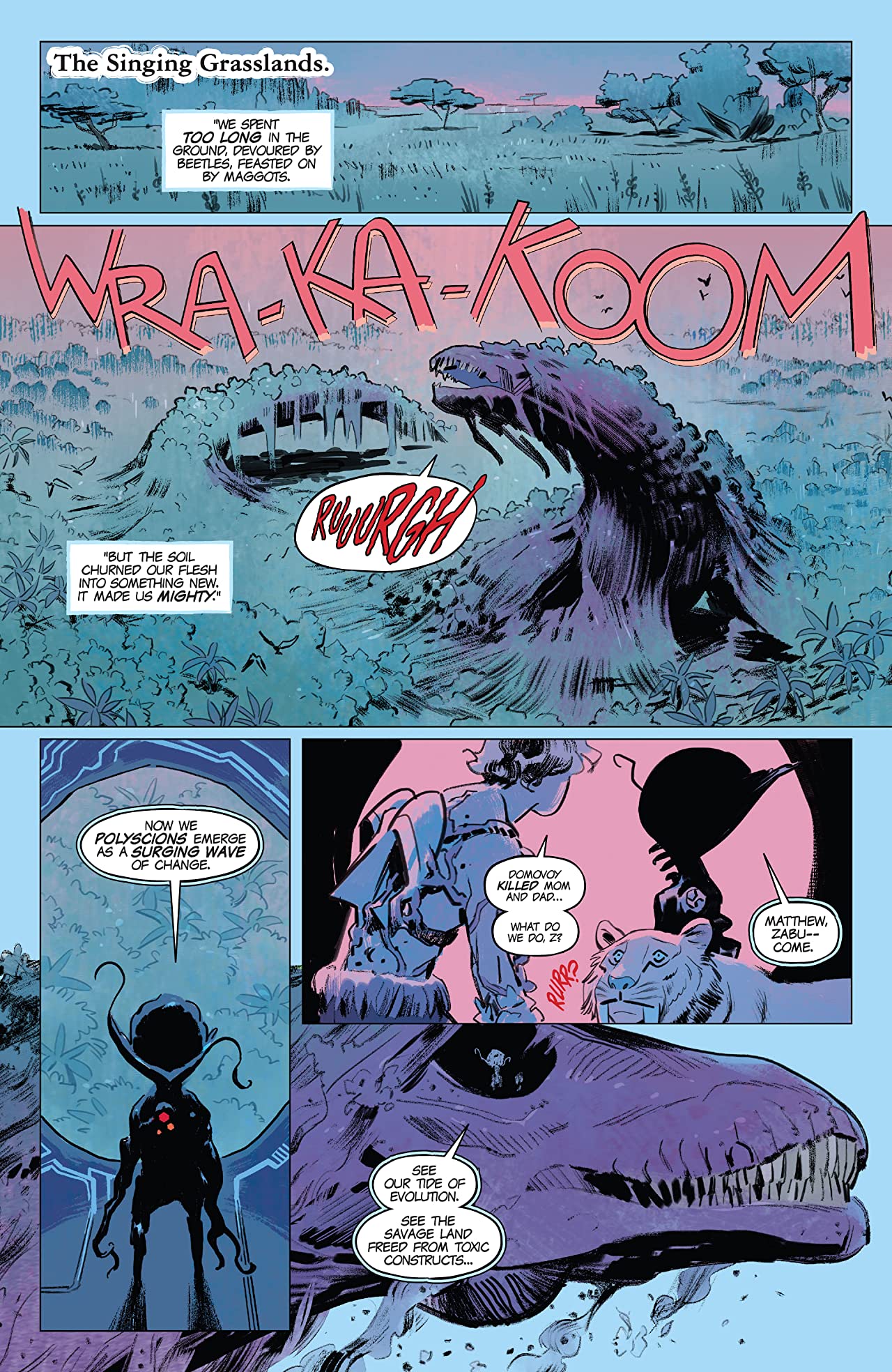 Honestly, I love when truly creative creators are given free reign to leave their mark on established characters, and that’s exactly what Thompson et al have done here, blending concepts perhaps more frequently associated with the likes of Swamp Thing and Animal Man into this fresh new imagining of Ka-Zar. Rather than it ever feeling derivative however, the creators manage to keep things feeling fresh and dynamic throughout, and the utilisation of the bio-technological horrors (dubbed “polyscions”) and Domovoy himself as antagonists helps to give the story some genuine stakes.