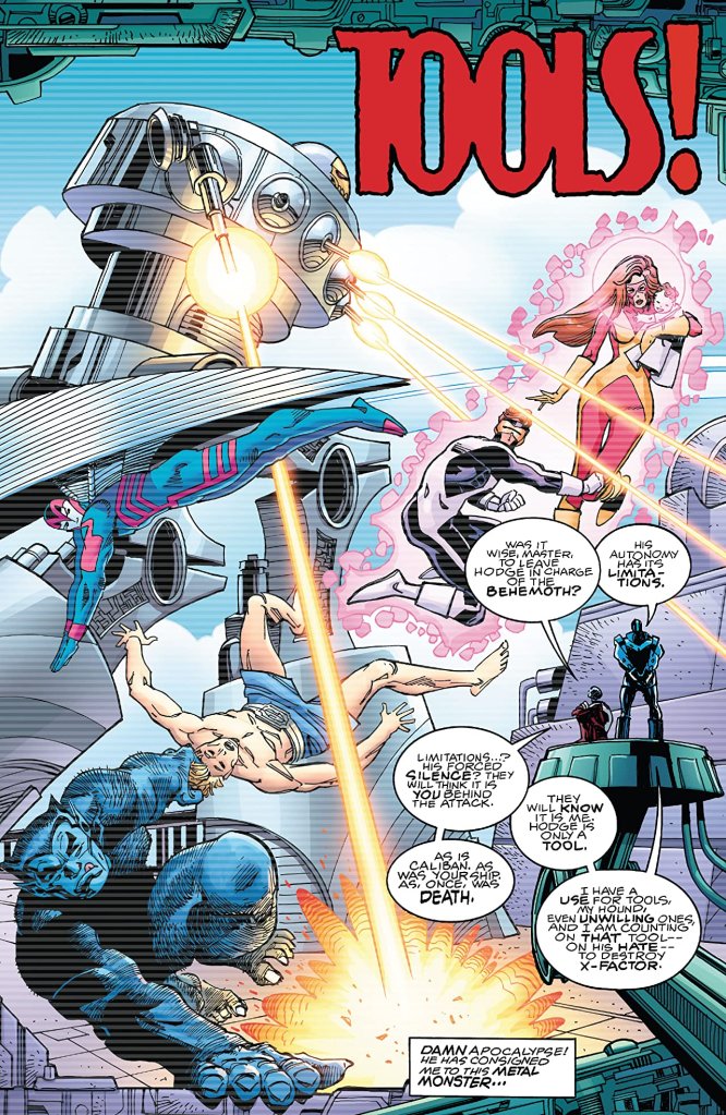 But due to this “all-new tale” being set just before the events of Issue Forty-Three of “X-Factor”, when an entirely intact team venture off into hyperspace together, any sense of Scott’s colourfully-garbed comrades-in-arms actually being in jeopardy during their confrontation against a mechanically-enhanced Cameron Hodge is arguably lost – even when two thirds of the way through the publication En Sabah Nur confidently announces that the super-heroes are about to die at the hands of their former public relations agent; “Brave talk. But the fight is all but over. Cyclops, Jean, Iceman, and Beast have fallen. Death and the infant are next.”