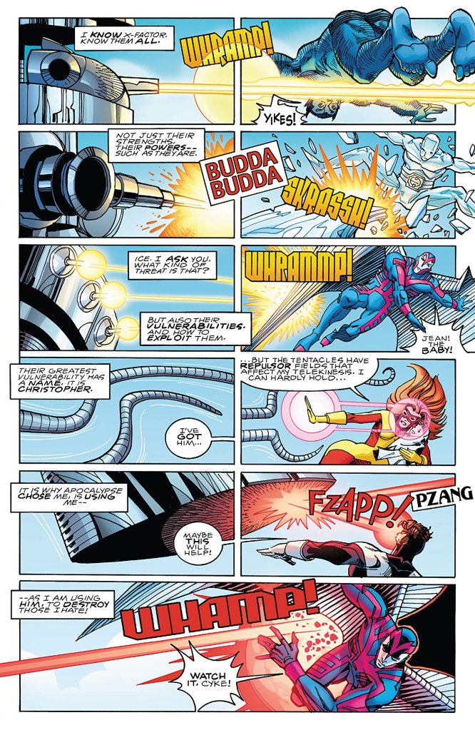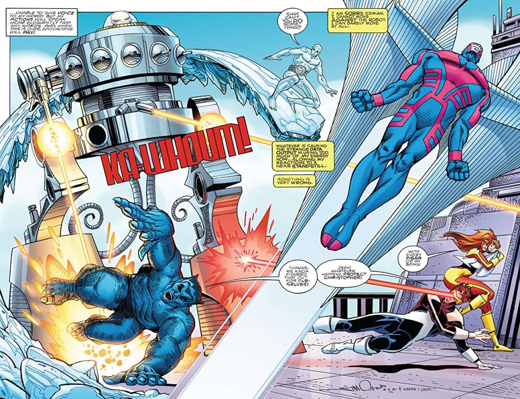 Fortunately however, the Atlanta-born author does try to make up for this debatable lack of tension, by posing the question as to just how the badly-battered mutants will ultimately overpower so seemingly invincible a robotic body as the one Apocalypse has conjured up for Warren Worthington’s old college roommate. The “metal monster” genuinely appears unstoppable at the start of the skirmish, with legendary artist Walter Simonson even pencilling Cyke’s ruby-red eye-beams harmlessly bouncing off of the towering brute’s armoured carapace and dangerously firing off wildly about the field leader’s surroundings.