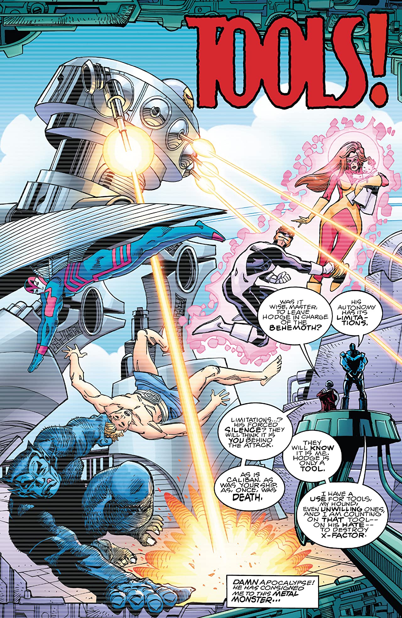 Fortunately however, the Atlanta-born author does try to make up for this debatable lack of tension, by posing the question as to just how the badly-battered mutants will ultimately overpower so seemingly invincible a robotic body as the one Apocalypse has conjured up for Warren Worthington’s old college roommate. The “metal monster” genuinely appears unstoppable at the start of the skirmish, with legendary artist Walter Simonson even pencilling Cyke’s ruby-red eye-beams harmlessly bouncing off of the towering brute’s armoured carapace and dangerously firing off wildly about the field leader’s surroundings.