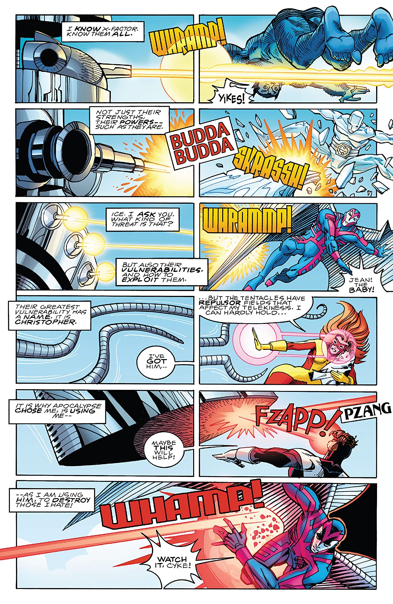 But due to this “all-new tale” being set just before the events of Issue Forty-Three of “X-Factor”, when an entirely intact team venture off into hyperspace together, any sense of Scott’s colourfully-garbed comrades-in-arms actually being in jeopardy during their confrontation against a mechanically-enhanced Cameron Hodge is arguably lost – even when two thirds of the way through the publication En Sabah Nur confidently announces that the super-heroes are about to die at the hands of their former public relations agent; “Brave talk. But the fight is all but over. Cyclops, Jean, Iceman, and Beast have fallen. Death and the infant are next.”