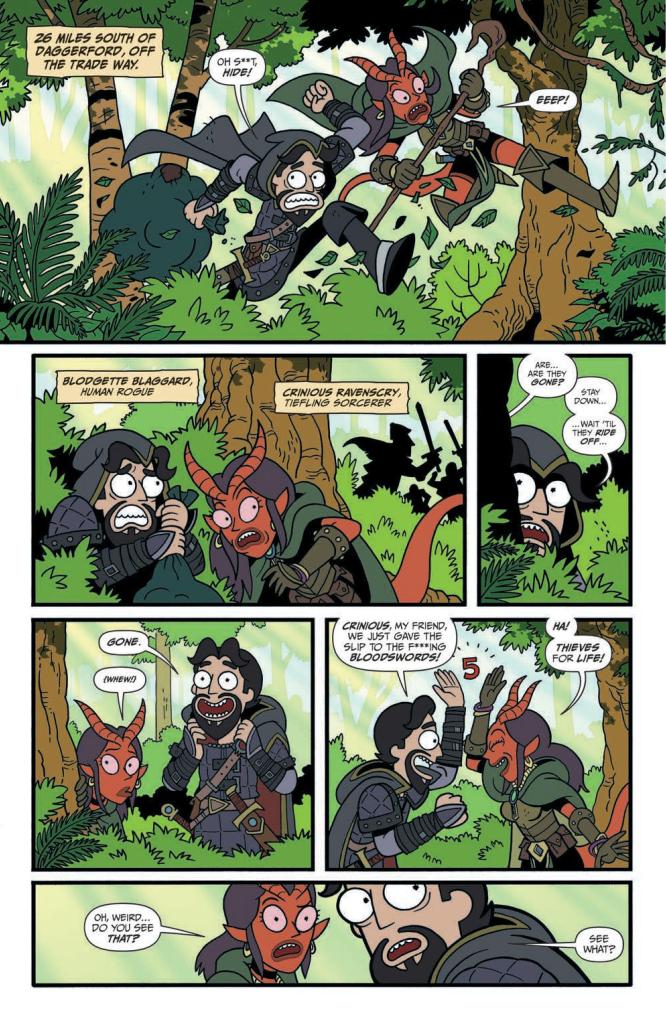 The rogue’s disconcertingly brutal downfall really is incredibly impactful, and establishes an increasingly dark-humoured theme which eventually turns the lonely Meeseeks into such a dangerous killer that even a trio of die-hard adventurers ultimately turn their back on the now foul-smelling, heavily-bearded creature before it leads their increasingly battle-weary party to a ghastly end. This ‘snowball effect’ makes for an enthralling read, especially once the bulbous headed creature summons an army of his own people and, following a tremendous attack upon an adult Blue Dragon, subsequently storms Castle Kludgemire in an effort to seize the King’s crown.