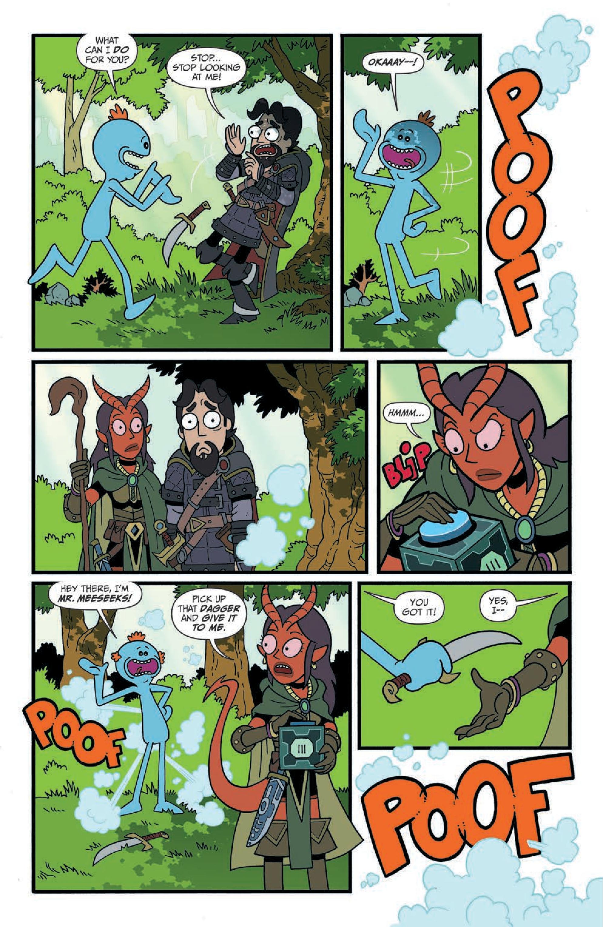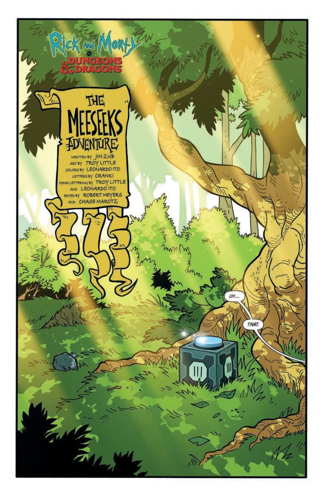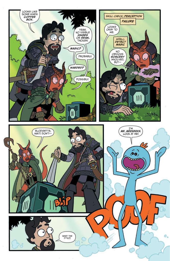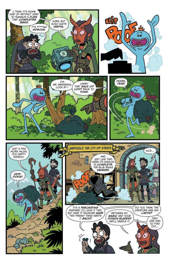 Whilst there are arguably few followers of the animated television series Rick and Morty who haven’t fast become fans of the blue-skinned humanoids universally known as Mister Meeseeks, Jim Zub’s decision to pen an oversized one-shot starring them somehow battling their way through Gary Gygax’s role-playing game likely had many of them scratching their heads in utter bemusement. Indeed, this comic’s opening unsurprisingly depicts the short-lived ‘task completers’ as mindless Djinn successfully achieving the physical burdens meted out to them by a couple of fairly unimaginative, low-level thieves; “Carry that sack of loot back to town.”