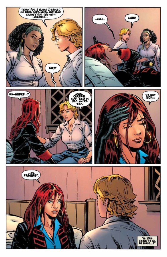Rather neatly bringing this comic’s second story-arc to both a satisfying and disconcertingly tragic end, fans of Stephanie Phillips’ incarnation of Anne Bonny should get a tremendous amount of enjoyment from Issue Eight of “A Man Among Ye”. In fact, considering that this twenty-page periodical’s plot so succinctly ends “one year later” with the central protagonist giving birth to a baby girl, it is sadly somewhat difficult to imagine where else the pirate queen’s future adventures could really go, unless the famed female buccaneer decides to once again threaten Governor Woodes Rogers’ control of the Caribbean.