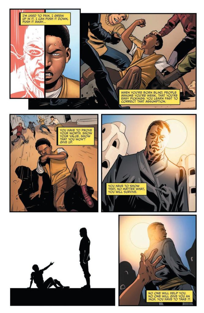 For those fans of Gene Roddenberry’s science fiction franchise Star Trek: The Next Generation – in particular LeVar Burton’s extremely heart-warming performance as the U.S.S. Enterprise-D’s Geordi La Forge – J. Holtham’s script for this twenty-page long one-shot is sure to prove a disconcertingly dark reading experience. In fact, it isn’t until the blind, recently beaten up adolescent mercilessly sets his own parents ablaze whilst the hapless couple are fast asleep in their bed during a flashback scene that it really strikes home just how different to the character’s televised counterpart this comic’s “permutation of the mirror universe” truly is.