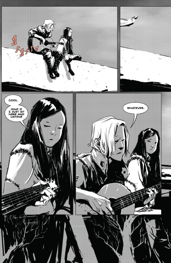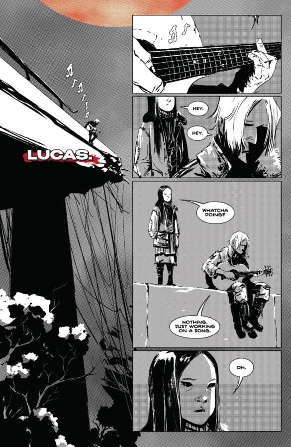 Complementing the writing we have the visual treat of Nguyen’s art and the accompanying letters from Wands. The almost monochromatic panels, I say almost as there are splashes of atmospheric colour, instantly put you in the horror mood and give the whole issue an ethereal quality. Each of the children’s’ personalities shine through, from the melancholy of Lucas, writing songs he’s doomed to forget, to the caricature mischievousness of the twins Ronnie and Raymond. There’s a fair amount of characters to get to know here but none of the introductions feel rushed, and Nguyen’s consistency is on top form. The little flecks of red after feeding, or the coloured scrawls on the walls are almost too good and have me second guessing their meaning.