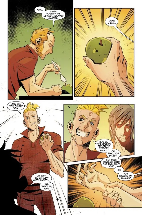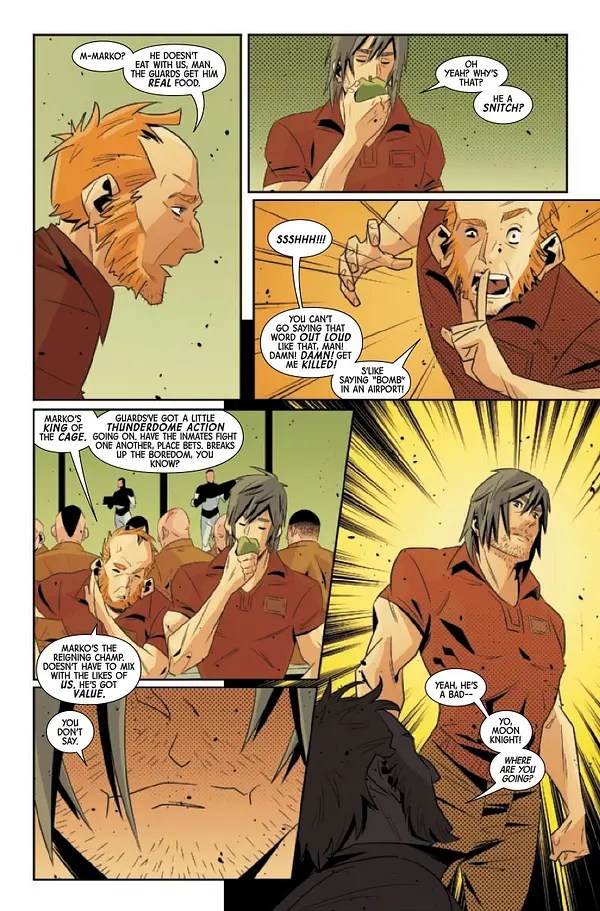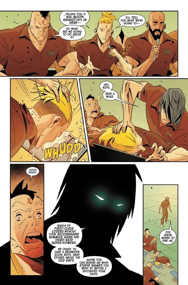 Built upon the foundation of a super-succinct opening summary as to just why Marc Spector has suddenly been “arrested by the Thunderbolts as part of Wilson Fisk’s crackdown on costumed heroes”, and locked up inside a high-tech prison, Jed MacKay’s script for his Devil’s Reign: Moon Knight one-shot arguably delivers one of the most savage depictions of the Fist of Khonshu ever seen on the printed page. Indeed, the masked mercenary’s harrowing fall into his old “wild dog days” is genuinely shocking, and demonstrates just how far the priest will go to protect those who seek his protection at the Midnight Mission.