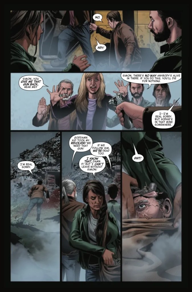 Happily, the same prodigious penmanship can also be found in Johnson’s presentation of a deserted mining facility which the surviving Spinners initially believe could be their sanctuary from the Alien infestation. Devoid of all signs of life, with numerous partially-derelict buildings gruesomely sprayed with blood splatters, this harrowing location immediately conjures up just the sort of scary sufferings which befell Alpha Station, and makes it abundantly clear that Jane’s group will find no safety amongst its gory ruins; “There’s no way anybody’s alive in there. If you do this, you’ll die for nothing.”