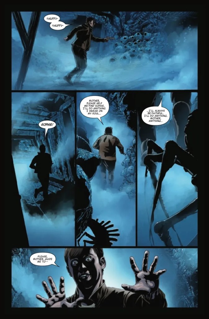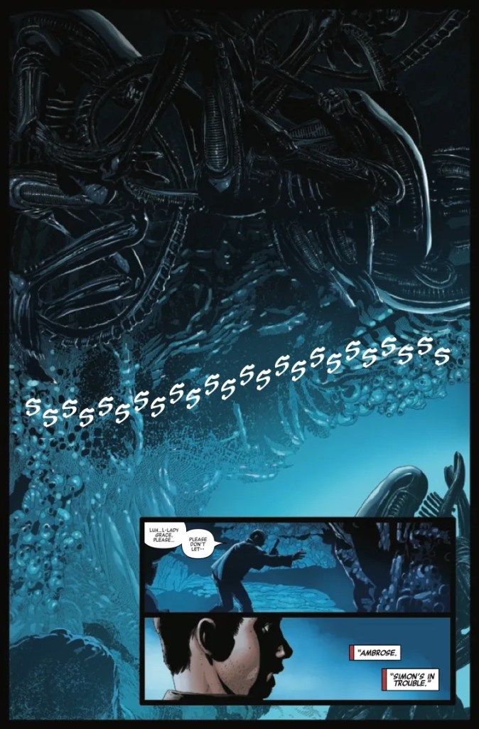 Introducing a “new terrifying type of Xenomorph” following the impregnation of multiple rodent-sized Tubers, Phillip Kennedy Johnson’s attempt to stamp his own creative mark upon the science fiction/horror franchise likely pleased the vast majority of this twenty-page periodical’s audience. For whilst the multi-limbed mass of teeth don’t actually make an appearance until the terrifying conclusion of this issue, once they do emerge – having literally burrowed their way out of several hapless settlers’ bodies – the swarming creatures arguably appear to be every bit as formidable a foe as their much larger extra-terrestrial brethren.