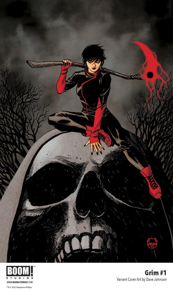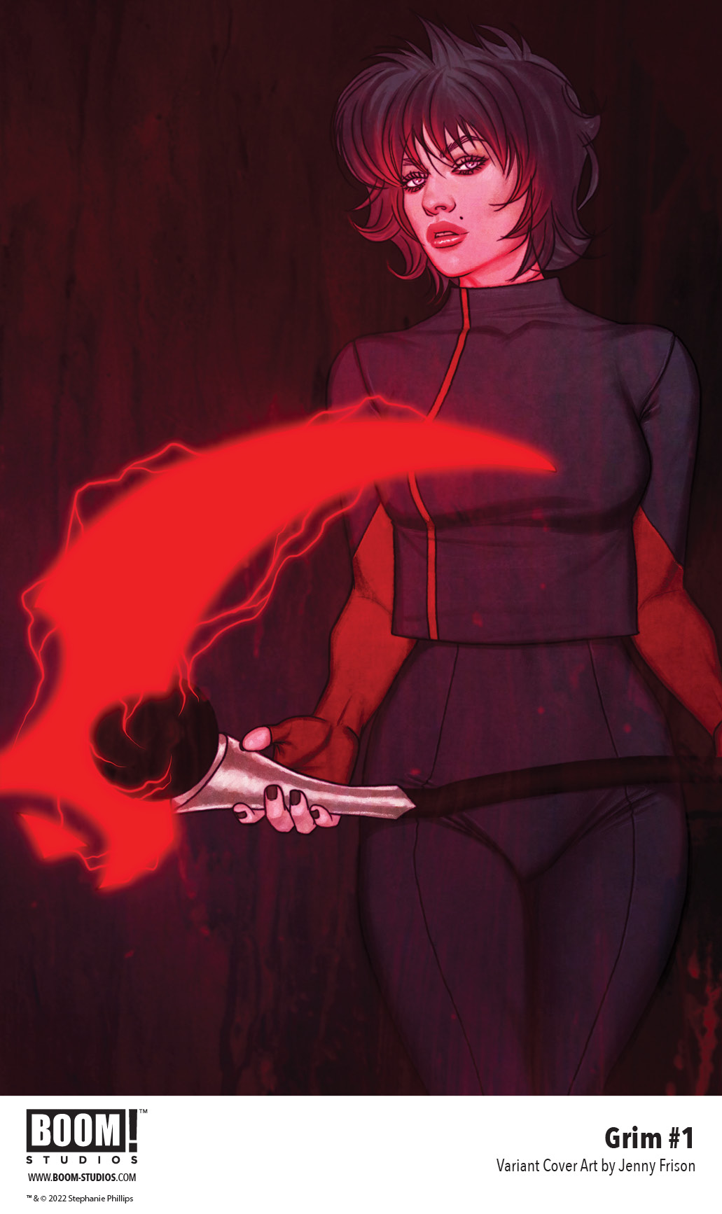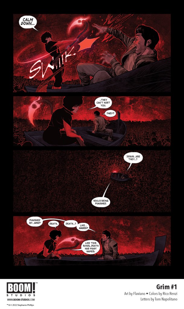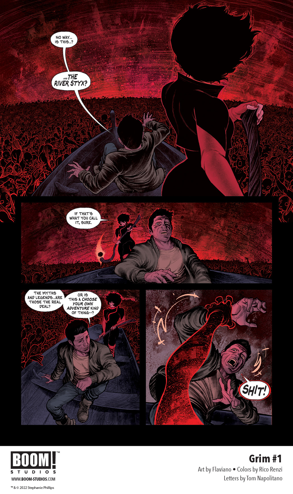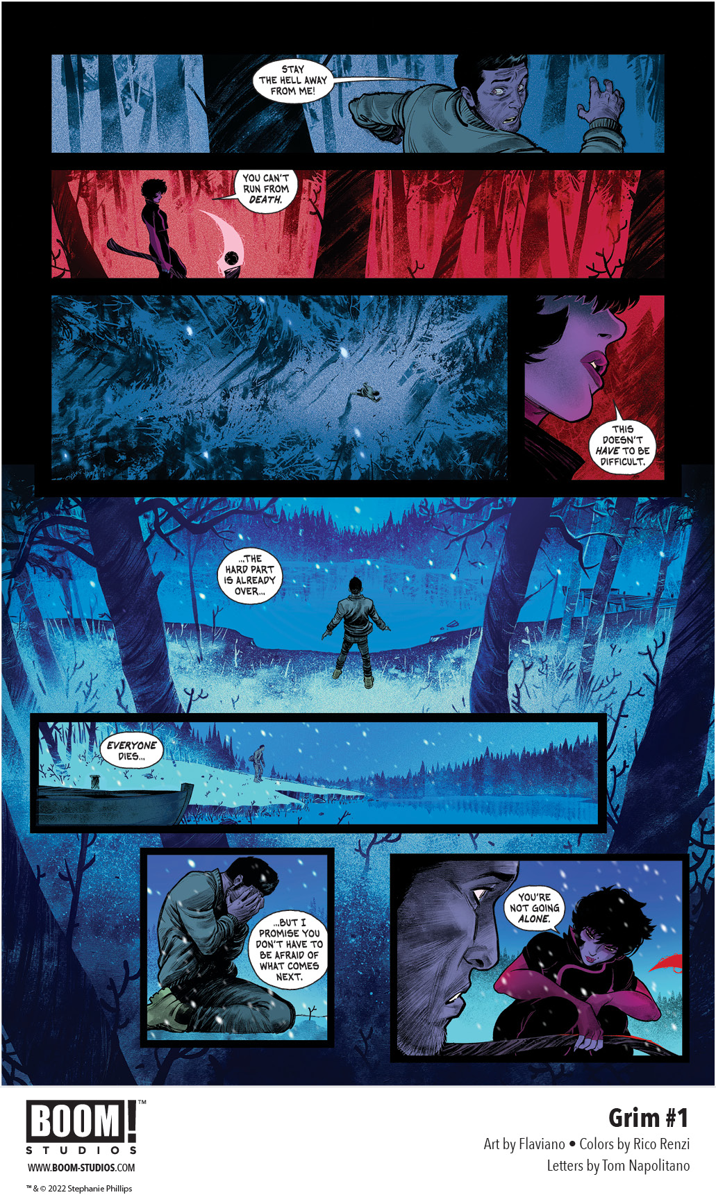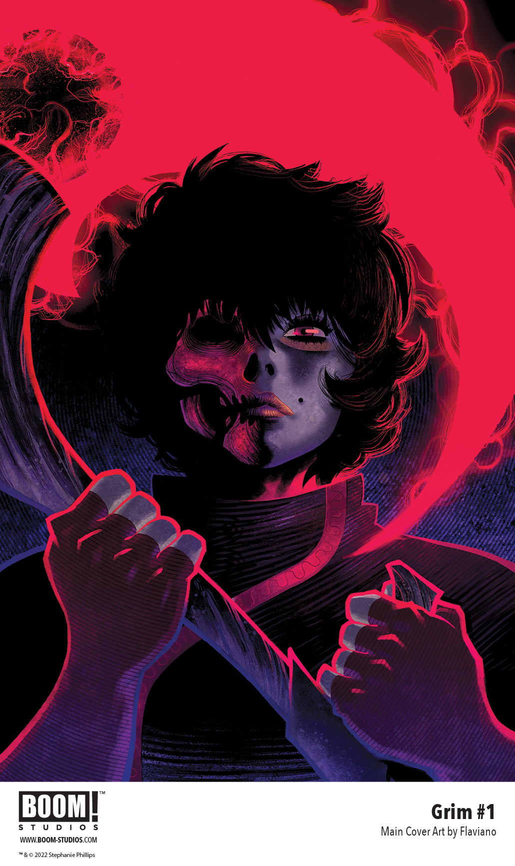 BOOM! Studios have released the first look at GRIM #1, a brand new ongoing series from writer (and BCP favourite) Stephanie Phillips, artist Flaviano, colorist Rico Renzi, and letterer Tom Napolitan. The new series, which launches this May, tells the story of a young woman with a macabre job and a mysterious death to solve . . . her own!