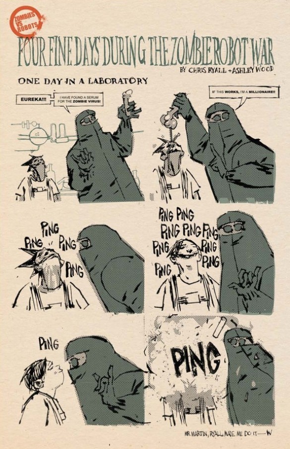 For those readers encountering this particular “re-presentation of the oft-forgotten Zombies Vs. Robots series by Chris Ryall and Ashley Wood” for the first time, the creative duo’s adventure ‘Inherit The Earth!’ will certainly provide them with a bit of a head-scratching storyline. In fact, this publication’s forty-one page long plot leaps all over the place with robots sacrificing themselves so another automaton can start up a television broadcasting company, the Undead’s infection supposedly being able to contaminate androids, and a doomsday droid deciding the only way to save the planet is to nuke its surface asunder with a plethora of atomic devices.