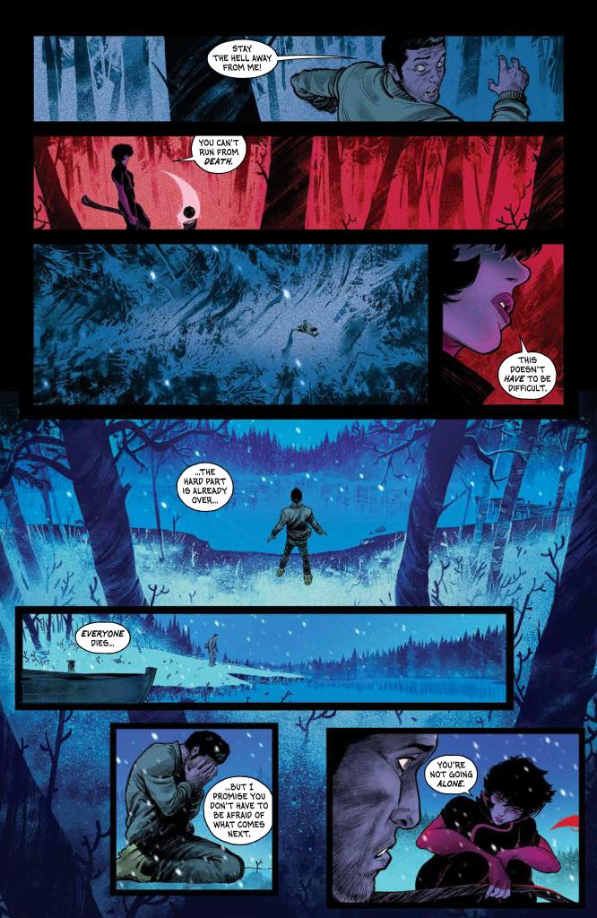Flaviano does a solid job with the artwork here, bringing this distinctive version of the afterlife to the page with a real confidence. The sequence on the “River Styx” in particular is a real visual treat with its sea of anonymous bodies. Also on the visual side of things, Rico Renzi’s colours do an impressive job of setting the mood, from the pale blues of the snow dusted crash-site to the striking magenta of Jessica’s outfit and scythe, and they particularly excel in the aforementioned “Styx” sequence.