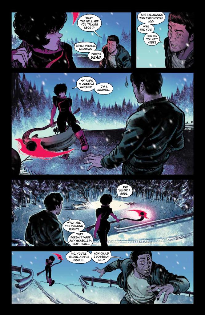 Jessica Harrow has no idea how she died. All she knows is that now she’s a Reaper, tasked with ferrying departed souls to their final destination. In the first issue of this new BOOM! Studios series, we get to see Jessica carrying out her duties by approaching unfortunate car crash victim Bryan and letting him know that he has officially shuffled off his mortal coil.