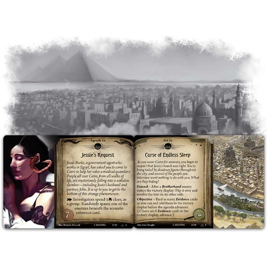 It explores and exploits the locational movement mechanics particularly well as you explore the Hotel, trying to decode clues and solve the mystery whilst avoiding the police, hotel guests, and less desirable types. It also gives you real, meaningful choices which fit well into the campaign narrative that the game emphasises so heavily. It’s widely regarded as the best Scenario pack available, and no wonder: it even has tremendous replay value in its variety of possible endings (Ms Scarlet, in the Ballroom, with the Necronomicon). But I would say that even better value is Guardians of the Abyss, originally the 2018 event pack and now available as a mini-campaign; if you’re in the mood for a daring romp through the alleys of Cairo and the realms beyond dream itself then this is the one for you.