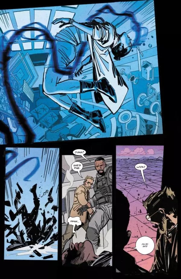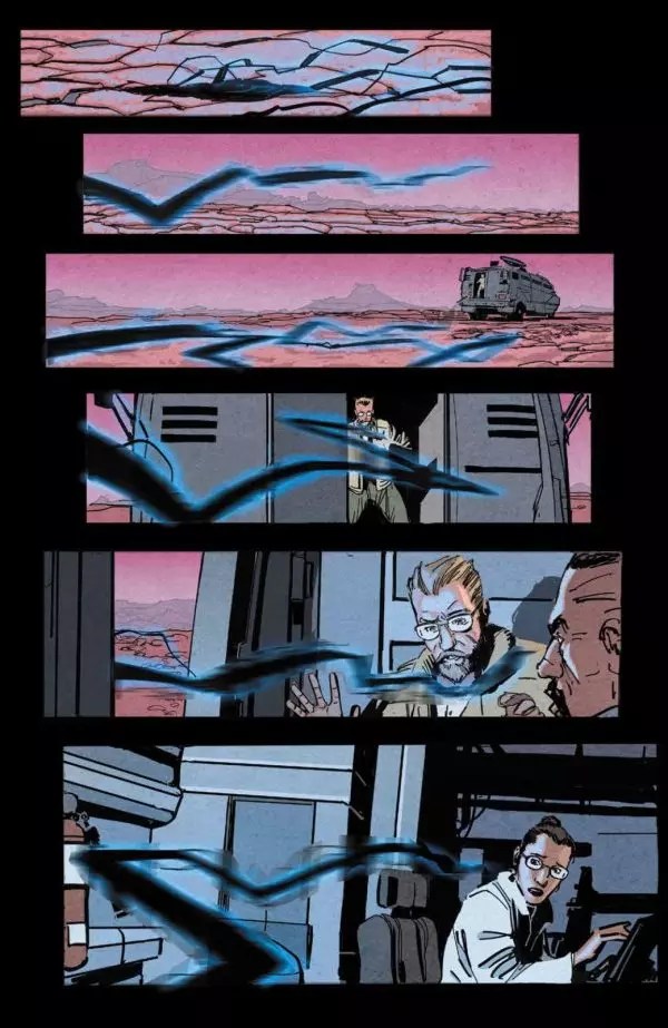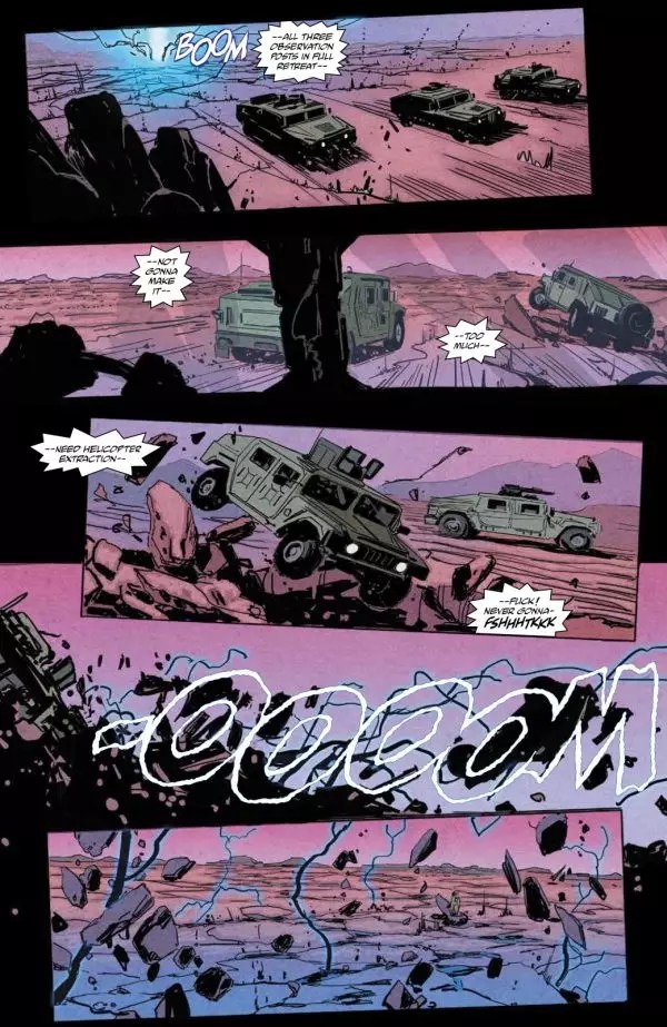 Lamentably though, this comic’s lack of solid storytelling also seems to adversely affect Ron Garney’s layouts, with the former “Captain America” artist somewhat struggling to find much inspiration with the script he was given, as Caldwell predominantly waxes lyrical to something resembling a Jedi Order remote droid whilst pottering through a well-equipped laboratory. In addition, it’s hard for even a two-time Eisner Award nominee to make a bland backdrop terribly exciting, even when the sun-baked landscape itself is being torn asunder by crackling energy beams and the occasional Humvee is shown fatally falling into a crater.