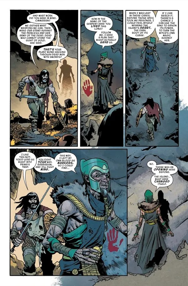 Narratively speaking, this issue could be viewed as something of a deep breath before the final roar, as Conan and Thoth-Amon regroup following their encounter with the former Princess Matoaka and try to decide on a plan to help them survive and escape the cursed island. Obviously, each man has vastly different ideas about the best way to do this, with Conan’s “blood and glory” violence-based approach unsurprisingly winning out.