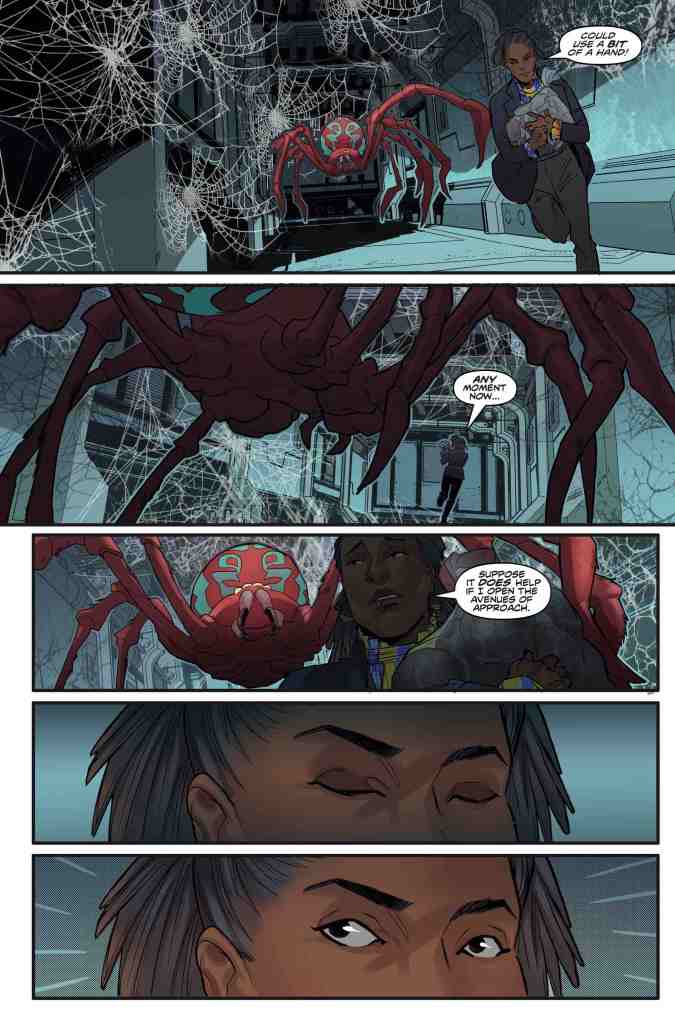 Fans of the fugitive Doctor will rather enjoy the opening to this “brand-new, never-before-seen adventure”, as the Time Lord’s flight through some heavily-webbed space station corridors definitely provides this twenty-two-page publication with a dynamic, adrenalin-pumping action sequence. However, whilst the short-tempered operative’s hasty dash away from a fast-approaching giant arachnid is entertaining enough, the rest of Jody Houser’s narrative concerning a mysterious, galaxy-wide threat by an unnamed cult is arguably a little on the lacklustre side.
