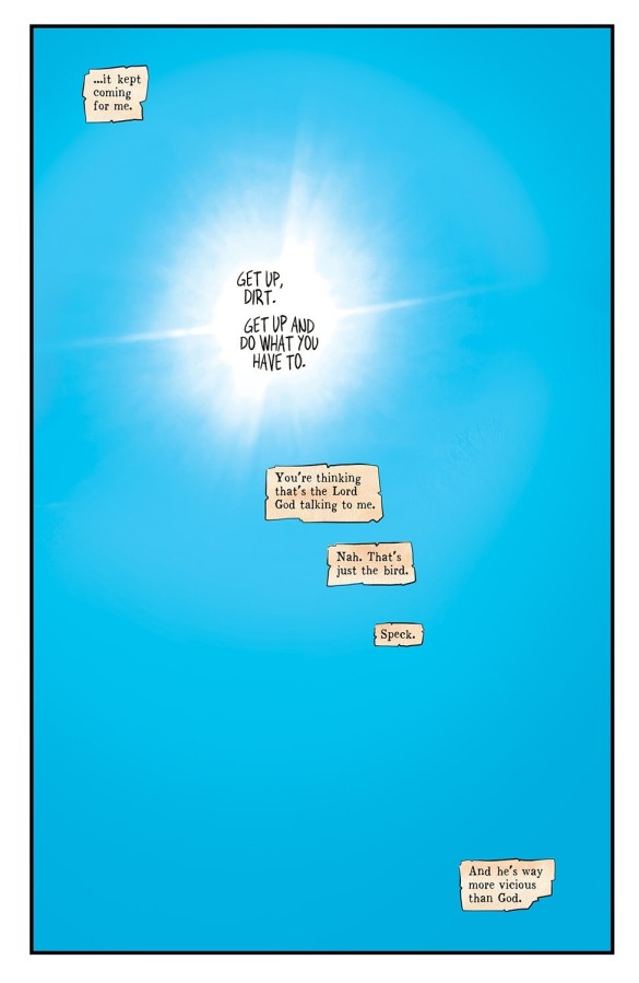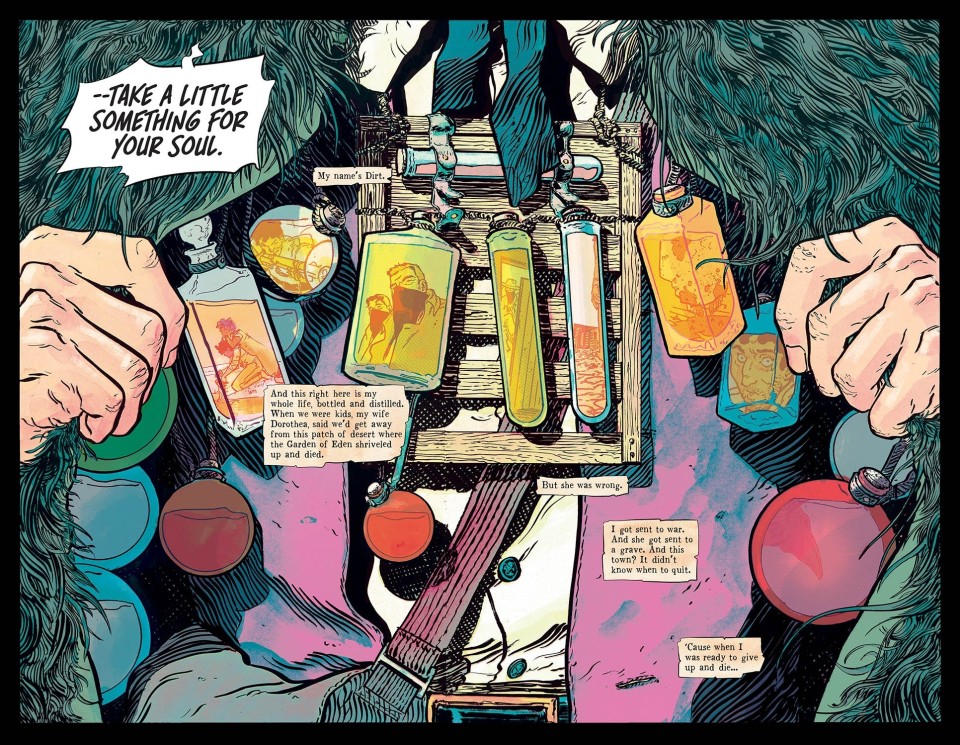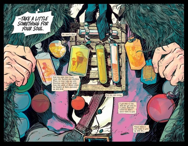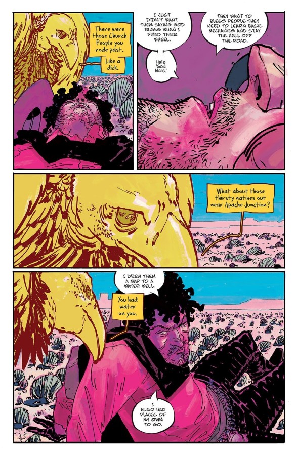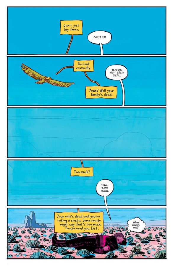 Lewis’ established knack for slightly eccentric world building and scene setting, coupled with Sherman’s scratchy, slightly uncomfortable artwork gives this series an unexpectedly punk rock vibe from the get-go. The colours are intentionally garish and jarring throughout, and Dirt’s companion on his journey – a magical, vengeance-seeking bird called Speck – adds a slightly trippy feel to the proceedings that really helps this series stand out from the rest of the ‘Western revenge’ books on the shelves.