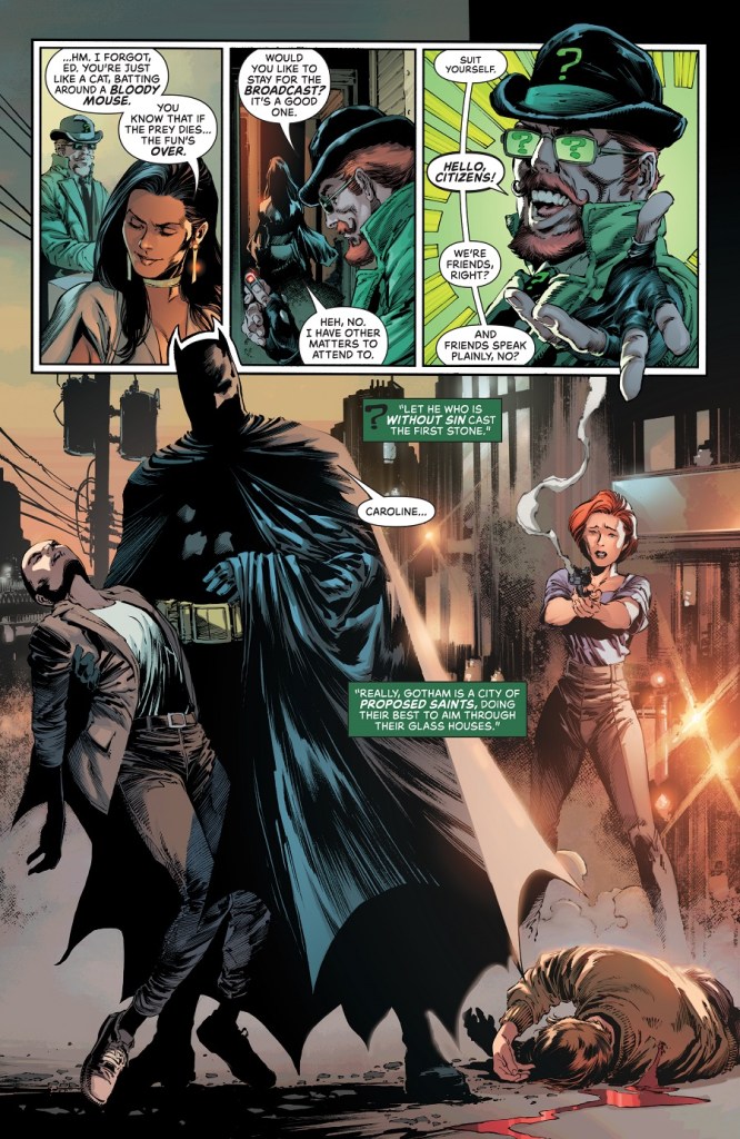 Mommy’s home! With Talia al Ghul back in town, anything can happen…and the mother of Robin is here to lay down the law. Meanwhile, the Riddler’s scheme to turn Batman’s sacred city into a twisted riddle of life and death has at last been revealed…and Edward’s going to use whatever and whoever he can to turn Batman’s life upside down.